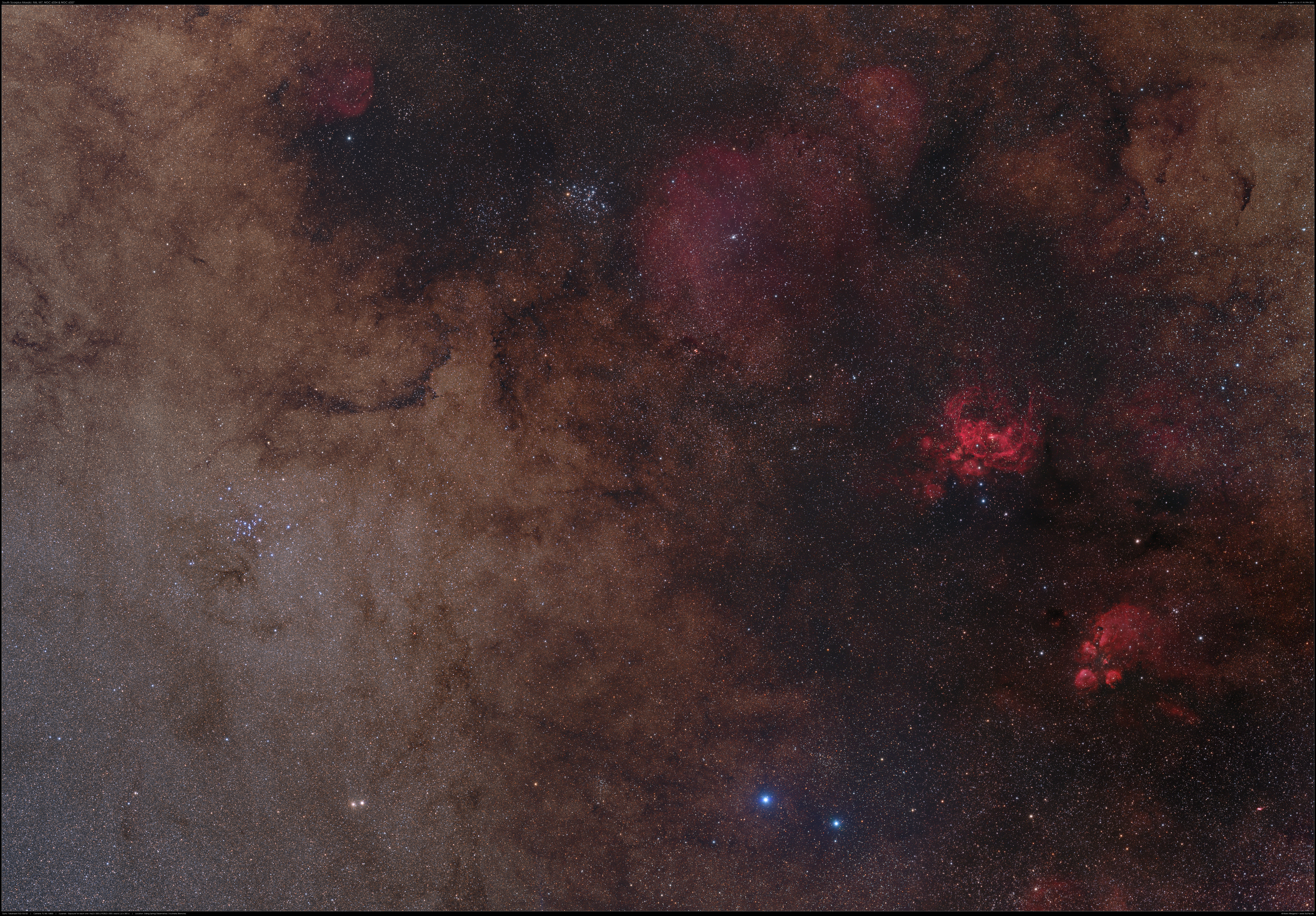 Dieses Bild ist ein Mosaik eines interessanten Gebiets im südlichen Teil des Skorpions. Sechs kombinierte Aufnahmen decken rund 10 x 7,5 Grad ab und enthalten neben Messier 6 und Messier 7 auch den Katzenpfotennebel (NGC 6334) und den Hummernebel (NGC 6357), sowie noch vieles anderes.