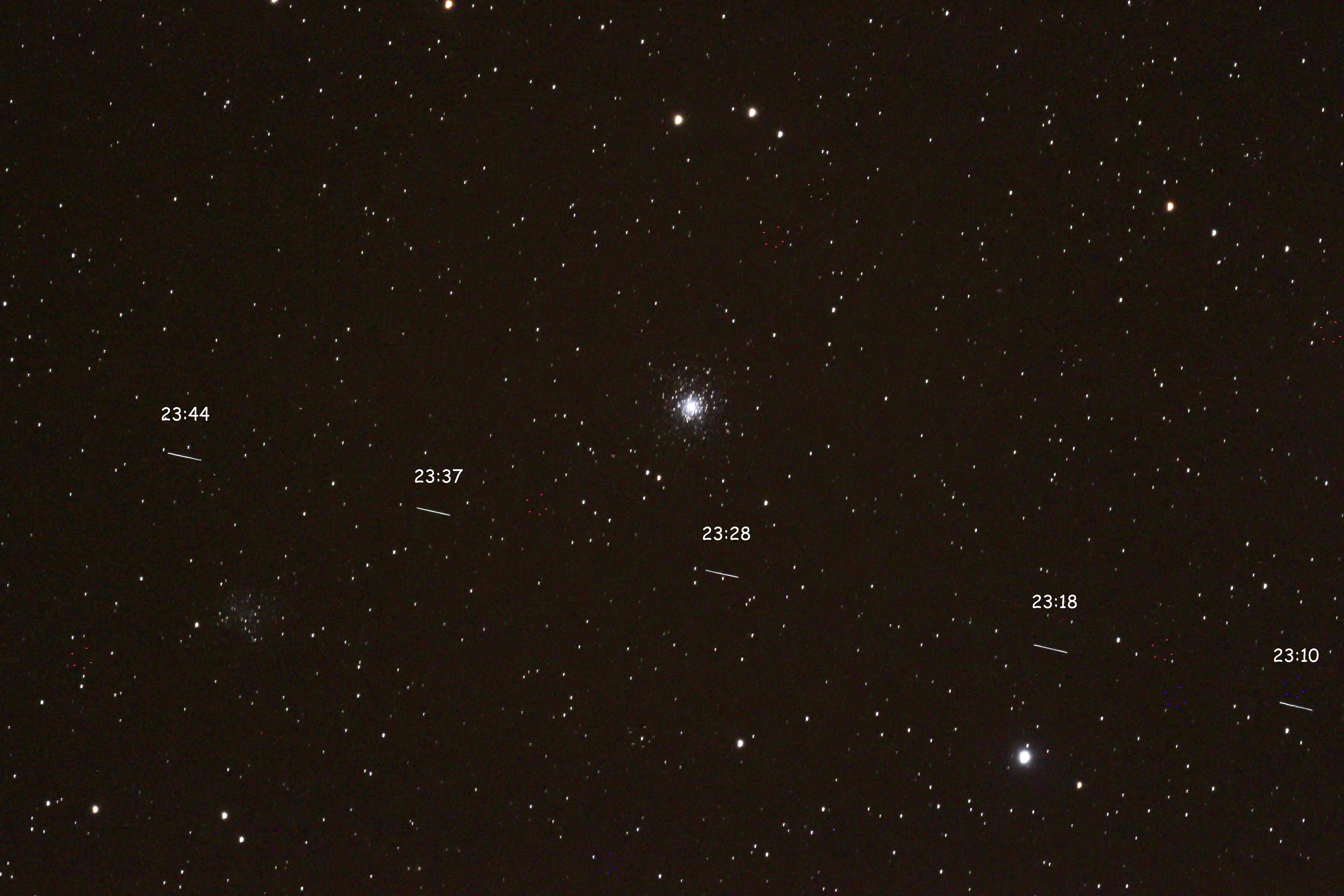 Und wieder mal wurde mir eine rätselhafte Strichspur beschert, als ich am 12. April 2018 das Gebiet mit dem Kugelsternhaufen Messier 53 fotografierte. Quadruplet 65/420 und Canon EOS 700D. Alle 75 Sekunden ein Bild von 60 Sekunden Belichtungszeit, dies zwischen 23:10 und 23:44 Uhr.