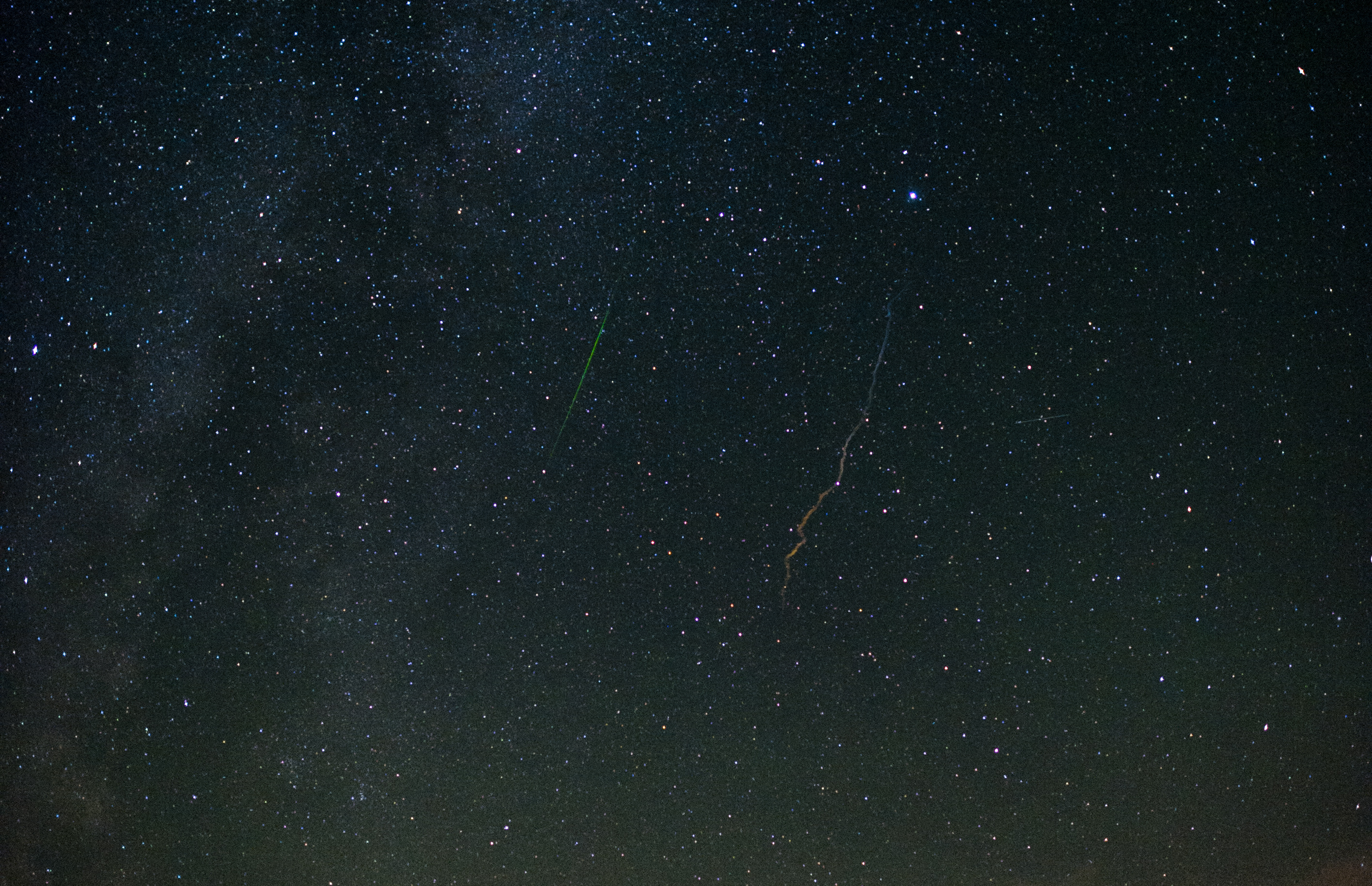 Auf unserem Meteorcamp auf der Schwäbischen Alb sahen wir am 13. August 2015 um 2:02 Uhr MESZ eine sehr helle Perseide Richtung Westen ziehen. Die nachleuchtende Spur war mit dem bloßen Auge noch einige Sekunden zu erkennen. Eine Reihe von Fotos zeigt die unterschiedlichen Farben in der Spur und die weitere Verformung durch die Höhenwinde. Etwa eine Minute