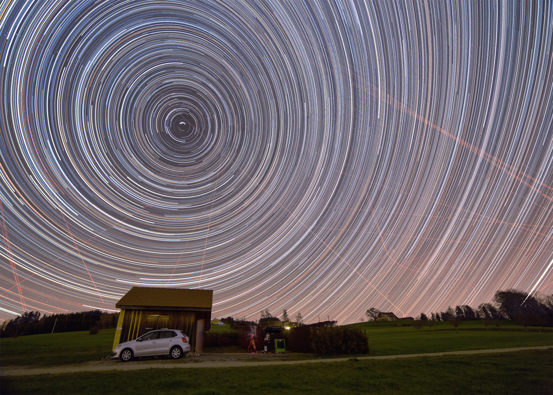 Die total knapp sechs Stunden lange Belichtung über der Sternwarte Antares zeigt neben den Aktivitäten der Teleskope und der Erdrotation auch den nächtlichen Flugverkehr.