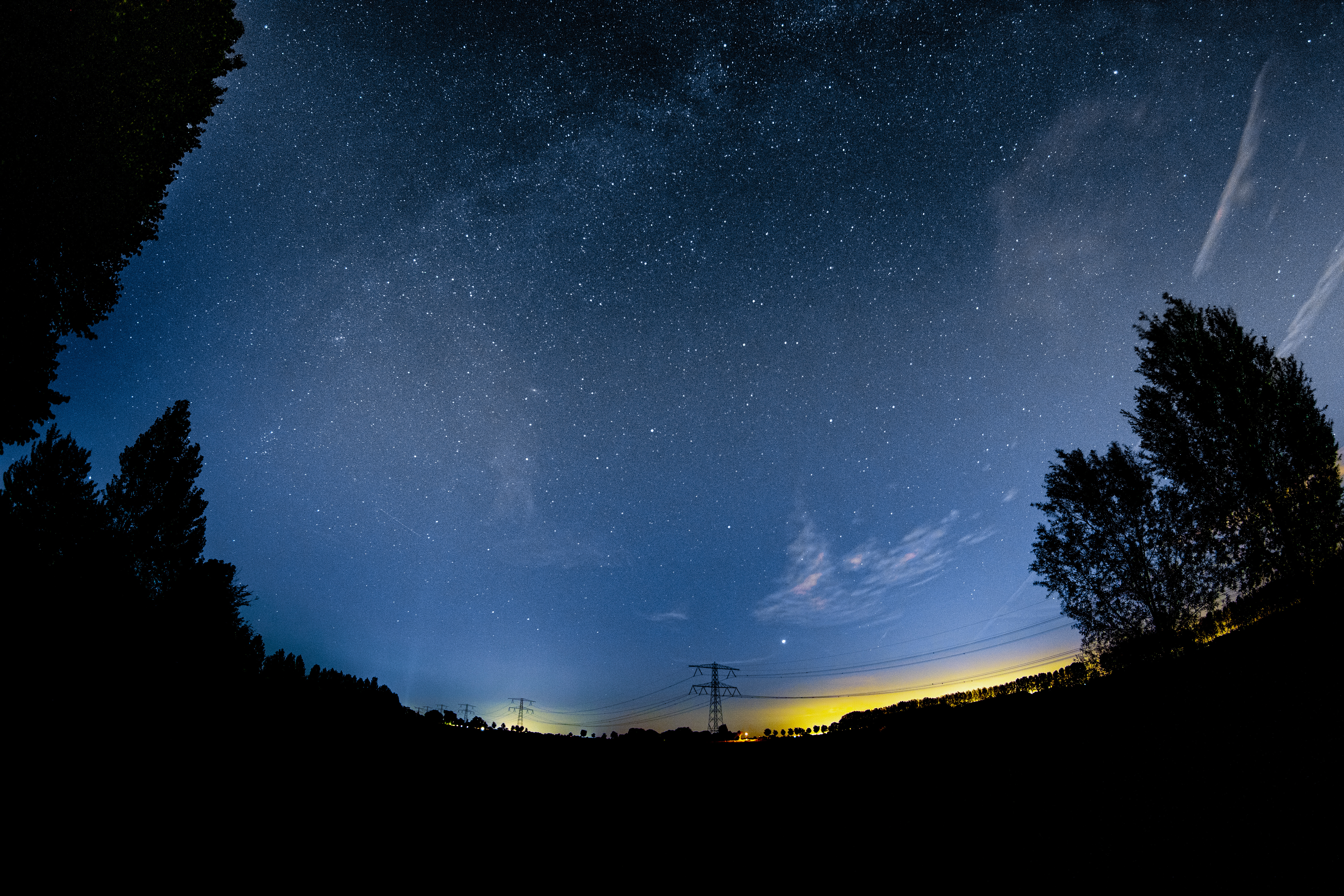 Nach einem schönen Urlaubstag in Zeeland war ich beim Anblick des Sternenhimmels noch gar nicht müde und entschied mich, ein paar Bilder schiessen. Obgleich ich einige Zweifel aufgrund der doch sehr hellen Städte Terneuzen und (in einiger Entfernung) Antwerpen hegte, wollte ich es versuchen. 50 m von unserem Wohnwagen entfernt gab es eine große Hecke, die vom Minicamping hinter mir abschirmte, und vor mir lag das gerade abgeerntete Feld mit tollem Panorama.