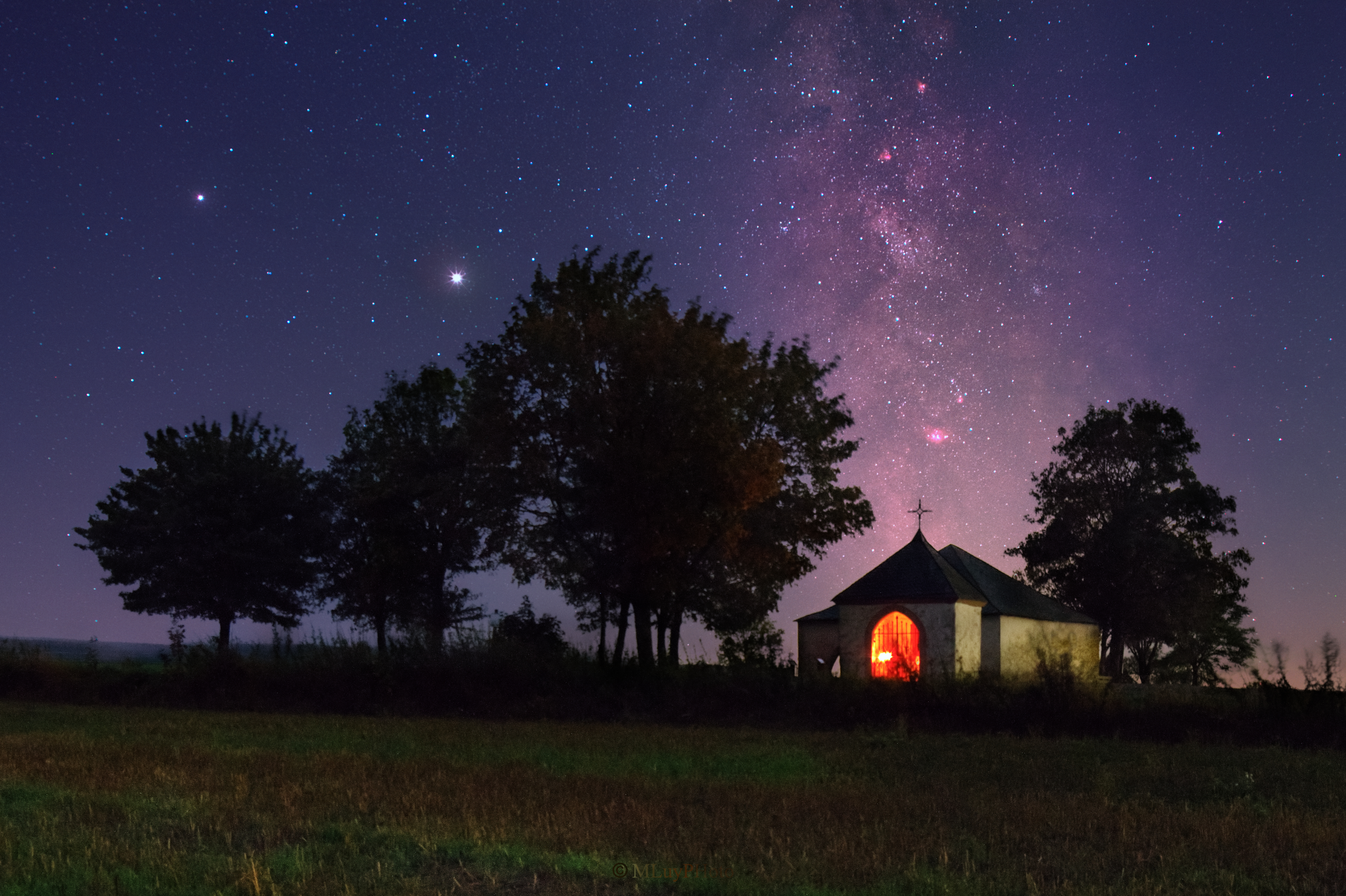 Zwischen den Gemeinden Irsch an der Saar und Vierherrenborn im Hochwald steht weithin sichtbar direkt an der Hunsrückhöhenstraße B 407 diese Kapelle mit altem Stallgebäude. 1734 wurde an dieser Stelle von einer hier ansässigen Bauernfamilie ein Bildstock zu Ehren der Muttergottes aufgestellt. 1838 baute man zum Schutz des Bildstockes diese Kapelle. Als Unterschlupf vor Wind und Wetter errichtete die Gemeinde Irsch 1928 für die hier auf der über 500 Meter hoch gelegene Gemarkung „Auf der Spain“ arbeitenden Bauern ein Schutzgebäude für Mensch und Vieh direkt neben der Kapelle. Vom im Volksmund heute „Speiner Bildchen“ genannten Ort genießt der Wanderer einen grandiosen Blick in das Saartal bis hinüber in den Saargau. Über der Anlage zeigt sich die Milchstraße sowie die hellen Gasplaneten Jupiter und Saturn.