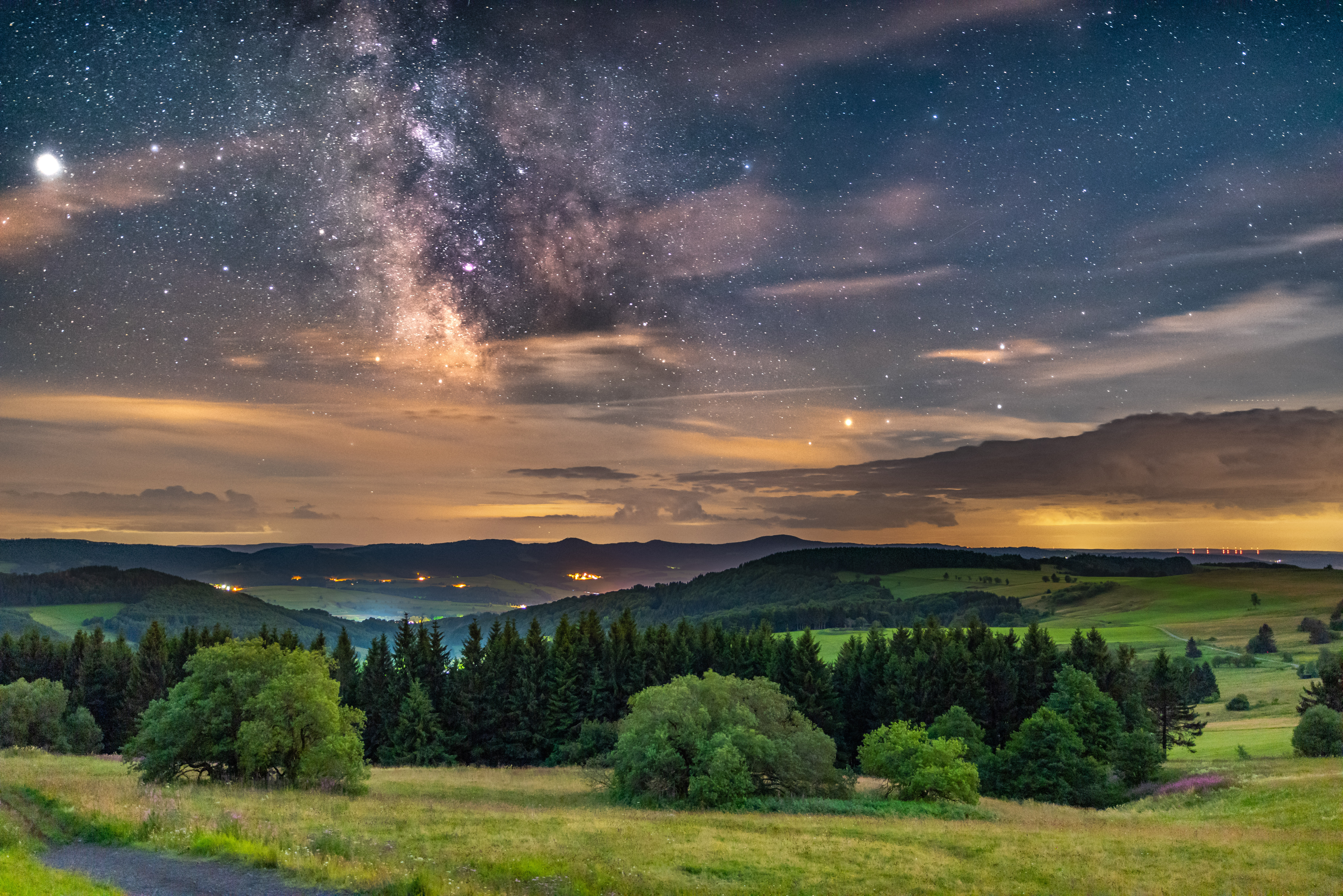 Nächtliche Landschaft mit Milchstraße im Sternenpark Rhön. Nikon D810 mit Sigma Art 28mm, 1.4, ISO 6400, 15 sec belichtet, Vordergrund wurde zwei Minuten mit ISO 800 belichtet.