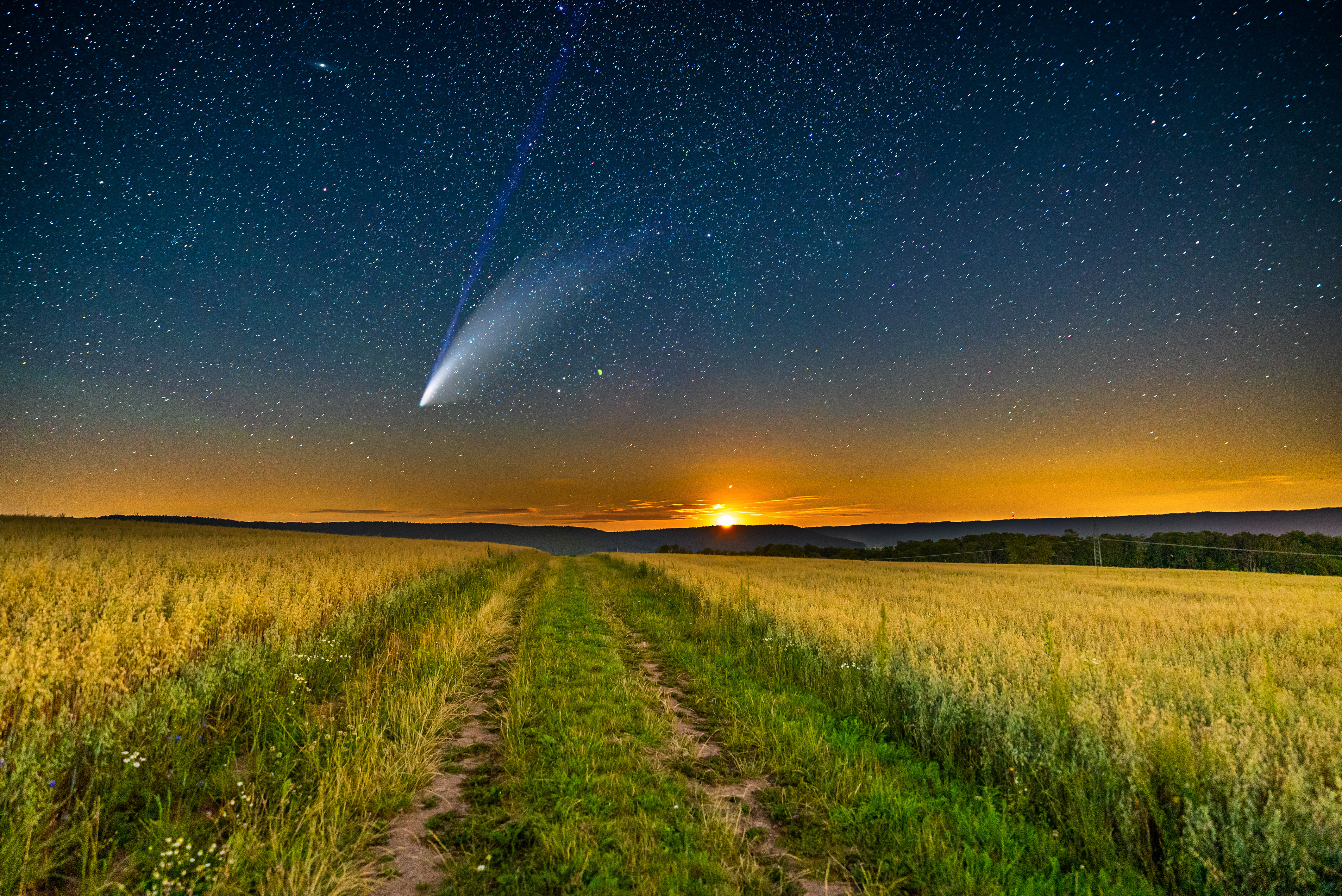 Sony A7s, nächtlicher Mondaufgang, Landschaft mit 20 mm, Komet mit 50 mm, Komposit.