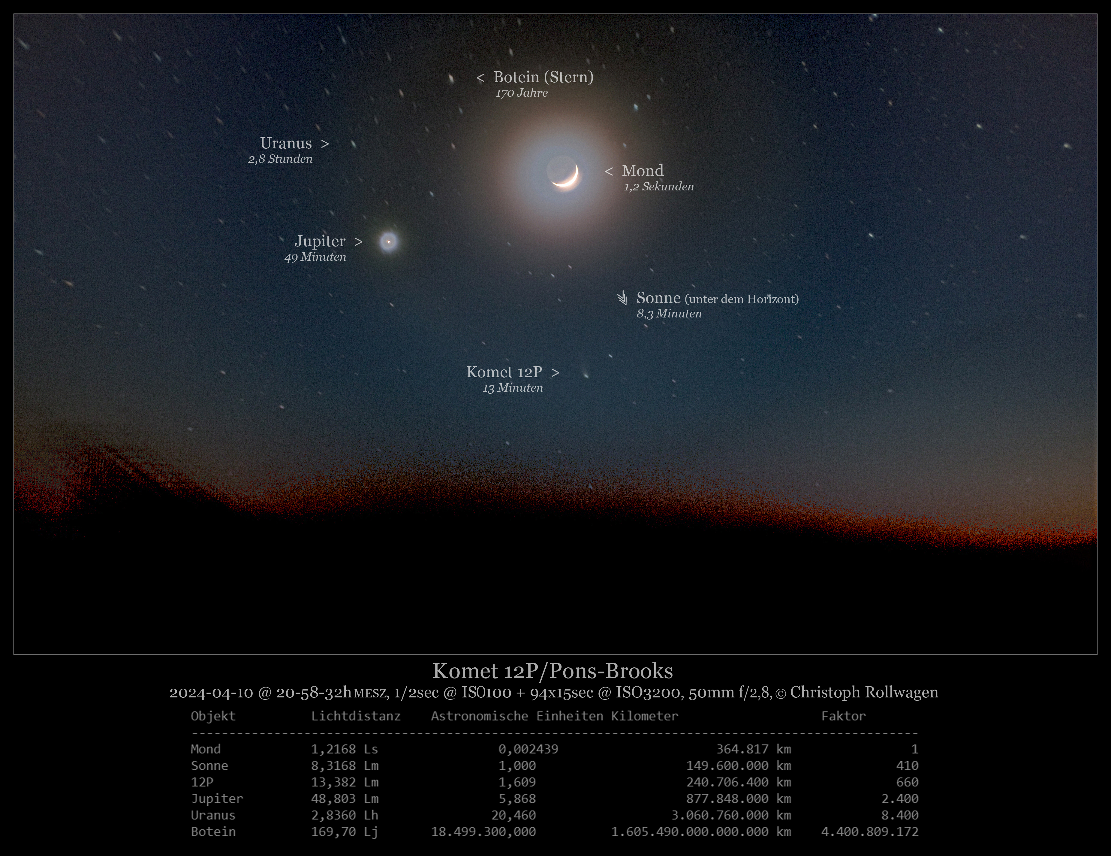 Am 10. April 2024 begegnete der helle Schweifstern 12P/Pons-Brooks in der Abenddämmerung sowohl der zunehmenden Mondsichel, als auch den Gasplaneten Jupiter und Uranus. Obwohl die Objekte am Himmel nur wenige Grad voneinander erkennbar sind, befinden sie sich tatsächlich jedoch sehr unterschiedlich weit von der Erde entfernt. Die Distanzen der im Bild markierten Objekte nehmen ausgehend vom Mond entgegen dem Uhrzeigersinn in großen Schritten zu. Das Licht, das uns vom Mond erreicht, ist nur 1,2 Sekunden bis zur Erde unterwegs. Die Sonne, die auf dieser Aufnahme bereits untergegangen ist, ist bereits 8,3 Lichtminuten weit weg. Das Licht vom Kometen Pons-Brooks benötigt etwa 13 Minuten bis zu uns, immerhin 49 Minuten vom Jupiter und sogar 2,8 Stunden vom Uranus bis zu unserem Heimatplaneten. Der Stern Botein im Sternbild Widder (delta Aries), der ebenfalls im Bildfeld erkennbar ist, befindet sich hingegen in einer beeindruckenden Distanz von knapp 170 Lichtjahren.