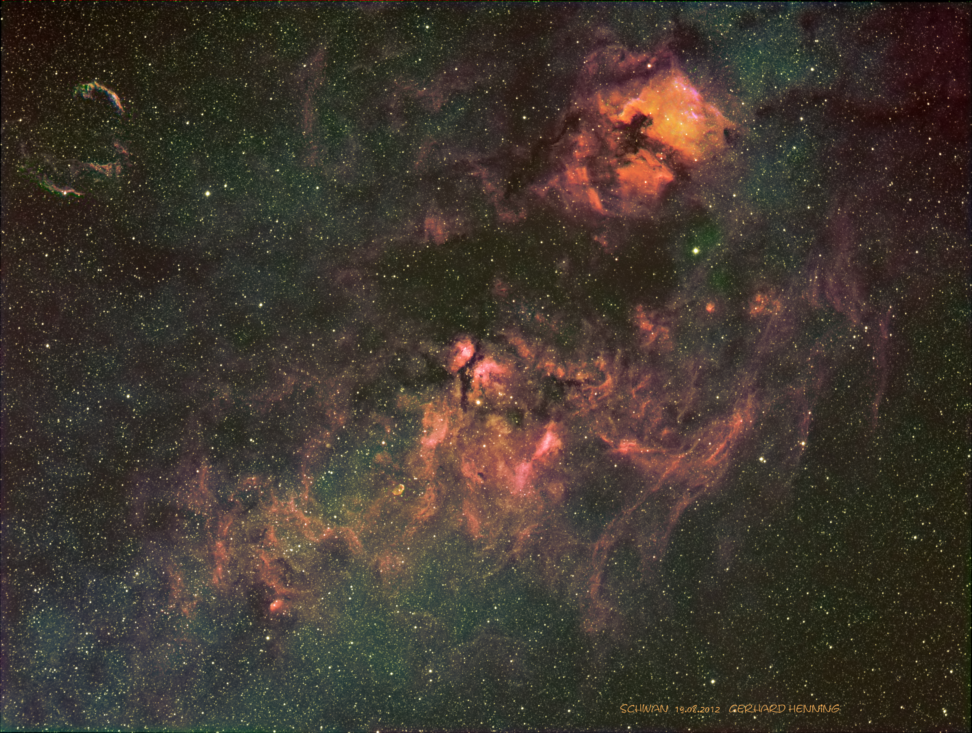 Im Sternbild Schwan sind viele bekannte Nebel versteckt: Nordamerikanebel, Pelikannebel, Cirrusnebel, Quallennebel.