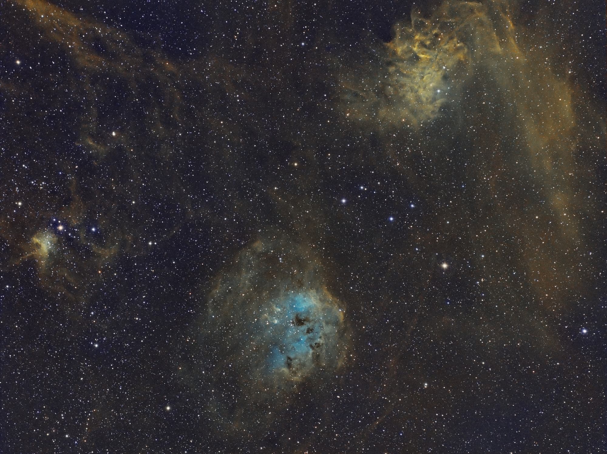 Der Fuhrmann gehört zu den letzten Sternbildern, die im Frühjahr abends aus Deutschland zu sehen sind und in denen sich galaktische Deep-Sky-Objekte beobachten lassen. Auch wenn das Sternbild bereits tief steht, konnte ich doch zwischen Ende März und Ende April sechs Nächte lang fotografieren. Herausgekommen ist dieses Schmalbandkomposit (SHO) mit einer Gesamtbelichtungszeit von 9,2 Stunden. Die Aufnahmen entstanden in Wetzlar Stadt mit einer ATIK383L+ an einem Borg71fl 400mm Apo (0.73x Reducer, f/4) auf einer EQ5. Pro nacht kamen etwa 90 Minuten zusammen, bedingt durch Vegetation und Mondschein. Zu sehen sind der Flaming Star Nebula IC 405 (oben), der Tadpole Nebula IC 410 (Kaulquappennebel, unten), sowie der Spinnennebel IC 417 (links). Bearbeitet in Pixinsight.