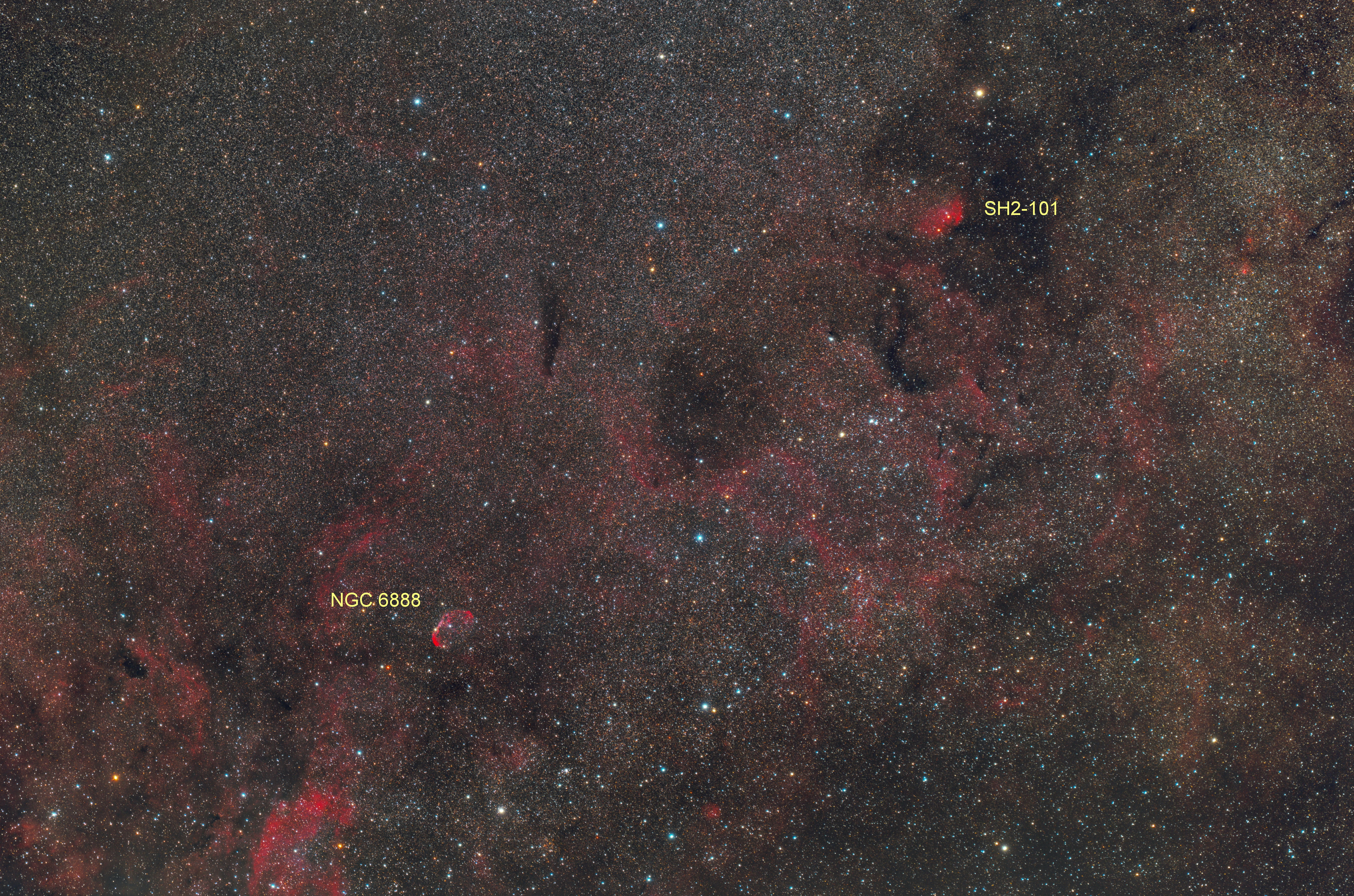 Im Sternbild Schwan befinden sich zahlreiche Dunkelnebel, wie der LDN 865 = Barnard 145, und einige Emissionsnebel, von denen zwei in dieser Übersichtsaufnahme mit Norden links besonders auffallen. Der Crescentnebel NGC 6888 wird vom Wolf-Rayet-Stern WR 136 angeleuchtet, der Tulpennebel SH2-101 ist von einigen Dunkelnebeln umgeben. Auch SH2-104 befindet sich im Feld.