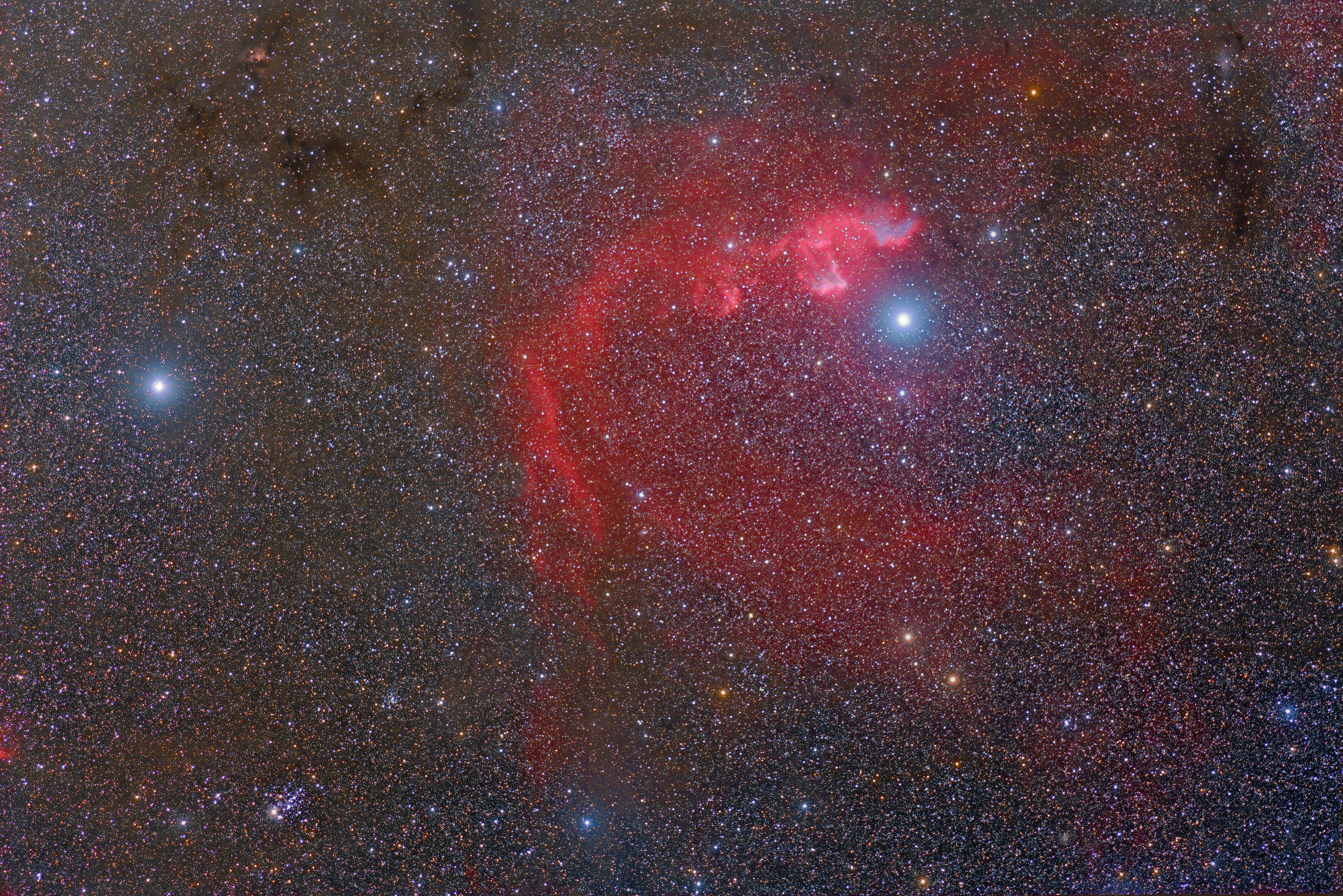 Während die hellsten Bereiche der ausgedehnten HII-Region Sh2-185 unter den Bezeichnungen IC59 und IC63 gut bekannt sind, ist der gesamte, sehr viel größere, aber auch sehr lichtschwache Nebelkomplex eher selten zu bewundern.