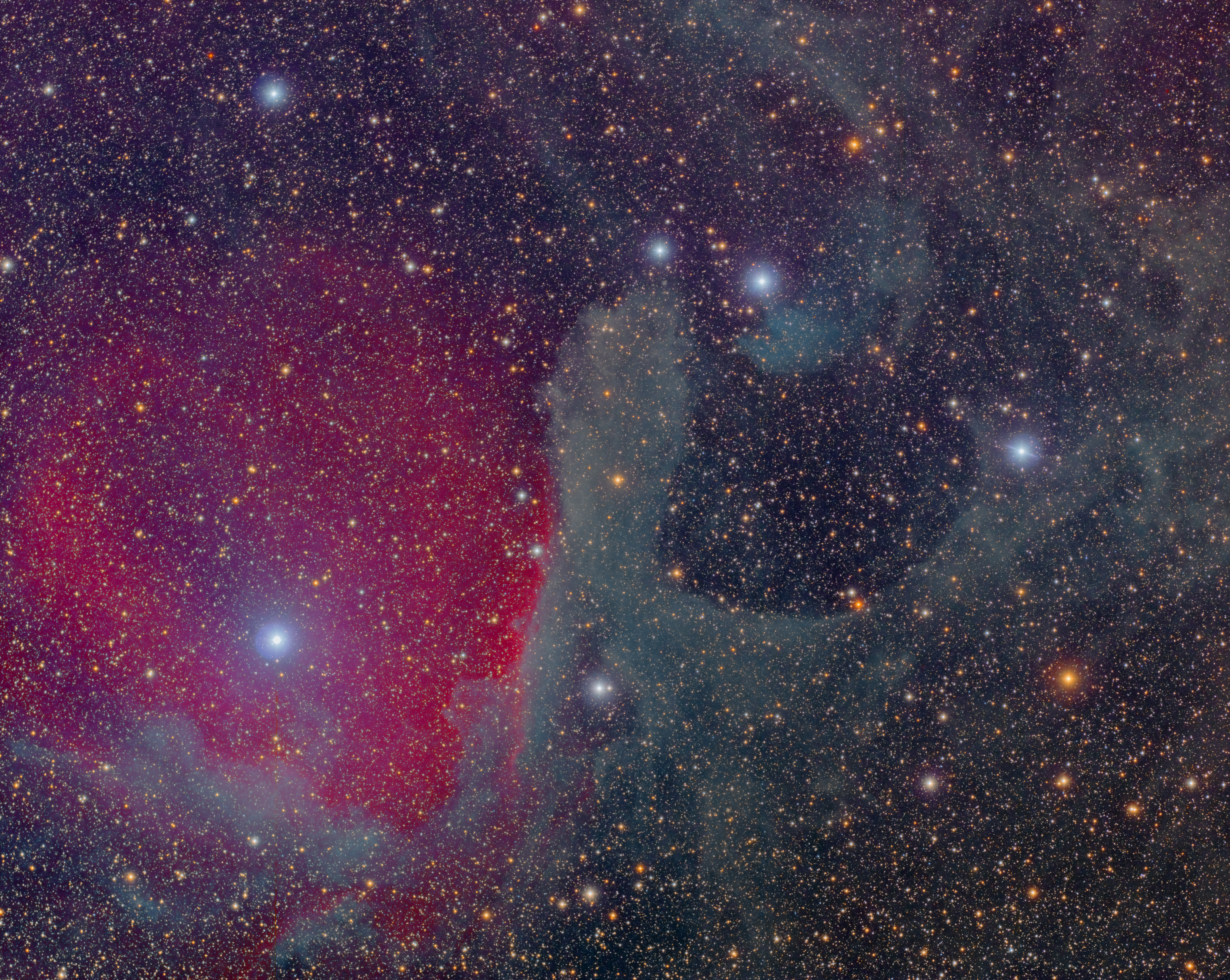 Die Nebelgebiete um Pi und Delta Scorpii wurden 1905 auf fotografischen Platten durch E. E. Barnard entdeckt. Rot leuchtend der Nebel Sh2-1, der durch die Energie von Pi-Scorpii zur Emission angeregt wird. Des weiteren im Bild sichtbar sind unzählige blaue Reflexionsnebel, die durch junge, so genannte Oriontyp Veränderliche Sterne entstanden. Namentlich sind das DG 129, LBN 1094 sowie Cederblad 125a und 125b. Das Bild entstand in mehreren Nächten im Juli 2018 auf der Kiripotib Gästefarm in Namibia.