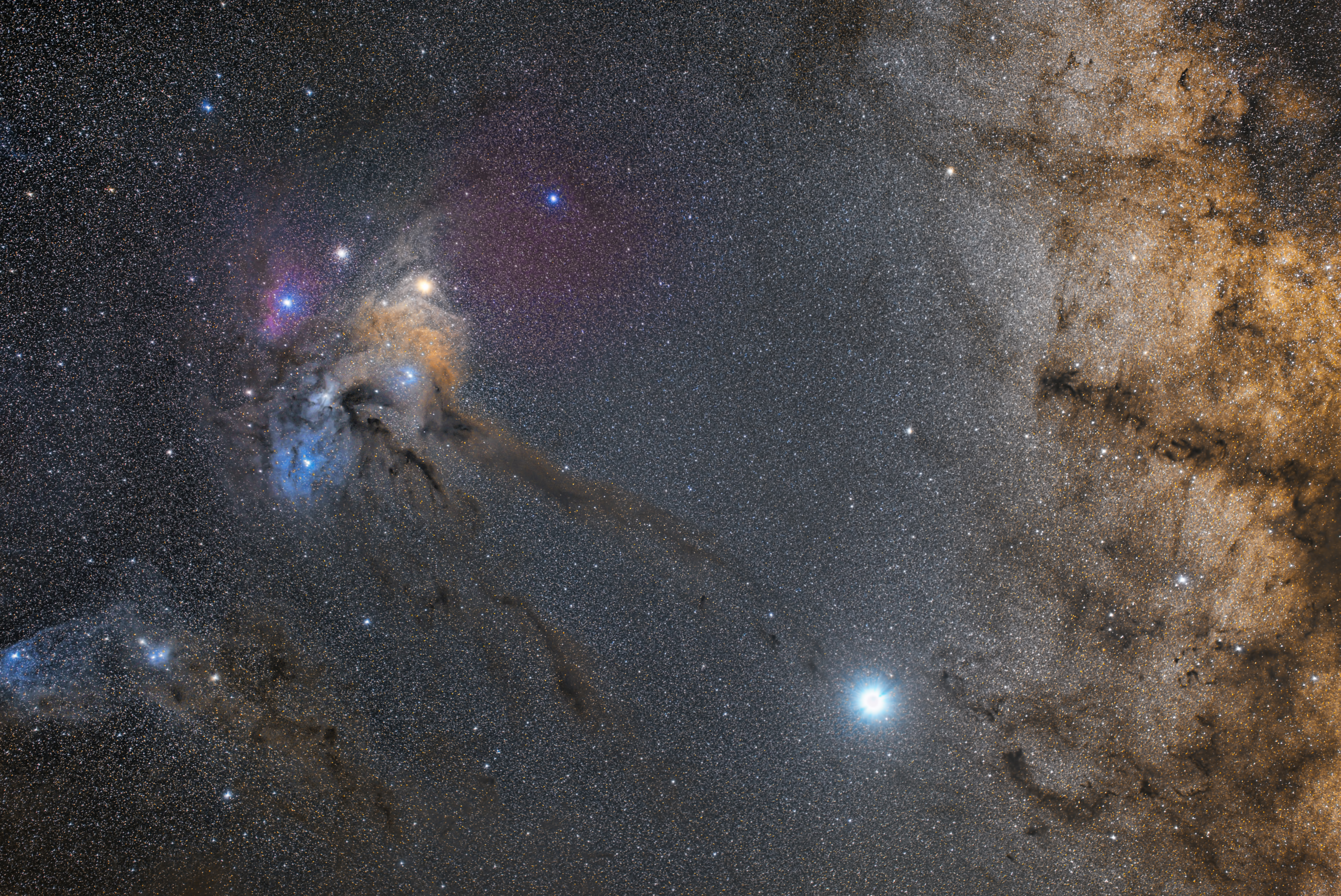 Eine der schönsten Regionen am Himmel, der Nebelkomplex um Rho Ophiuchi / Antares. Hier wird das interstellare Gas von verschiedenen Sterntypen angestrahlt, was zusammen diese hübsche, bunte Komposition ergibt. Östlich des gelben Antares-Nebels durchzieht den Himmel "der dunkle Fluss", der Dunkelnebel Barnard 44. Am rechten Rand sind die Ausläufer der Milchstraße, mit den Beinen des so genannten "dunklen Pferds" zu sehen, der helle "Stern" dazwischen ist der Planet Jupiter.