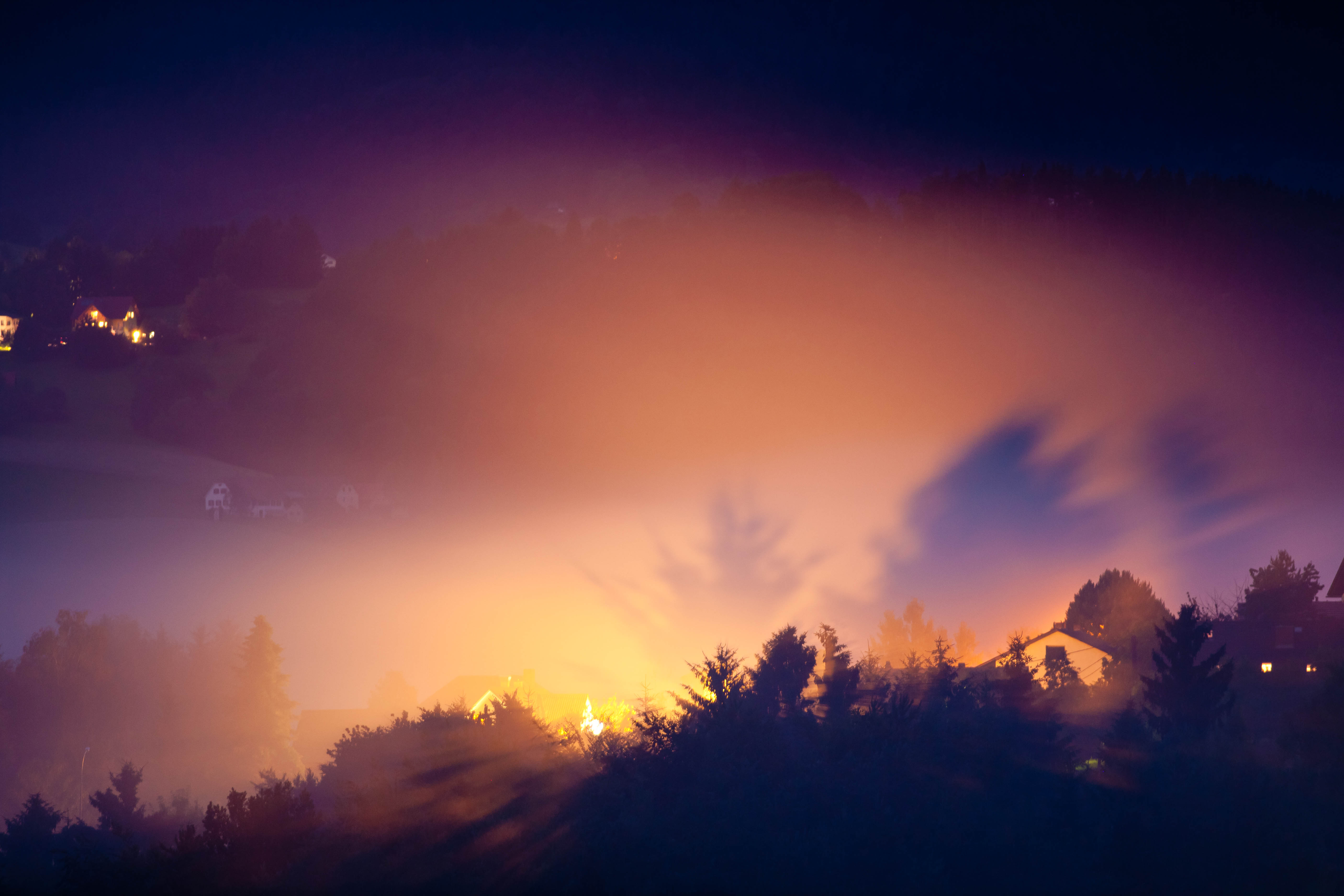 Wenn sich in der Nacht dünne Nebelbänke bilden, die durch die ungleiche Abkühlung von Luft und Land zustandekommen, werfen künstliche Beleuchtungen manchmal skurile Schatten auf die Nebelschicht. Dieses Bild wurde von leicht erhöhter Position mit einem Teleobjektiv aufgenommen.