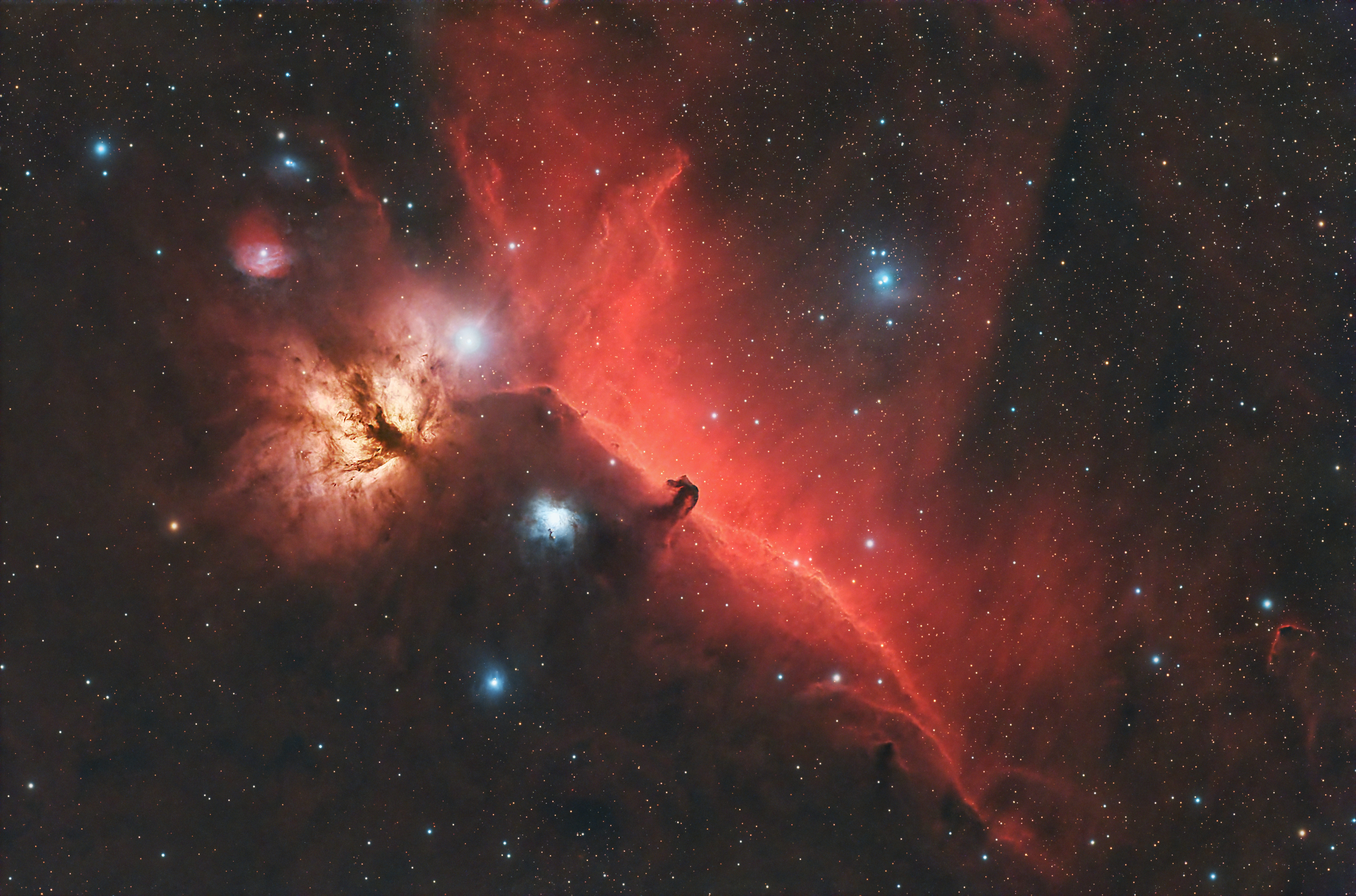 Die Winterklassiker IC434 der Pferdekopfnebel wobei der Pferdekopf selbst als Barnard 33 bezeichnet wird. NGC 2024 der Flammennebel und der kleine blaue Reflexionsnebel NGC2023. Alle drei im Bereich des Gürtelsterns Alnitak im Orion gelegen. Leider hat der Dual-Schmalbandfilter am sehr hellen Stern Alnitak ein deutliches Halo erzeugt. Aufgenommen in zwei Nächten aus dem heimischen Garten.