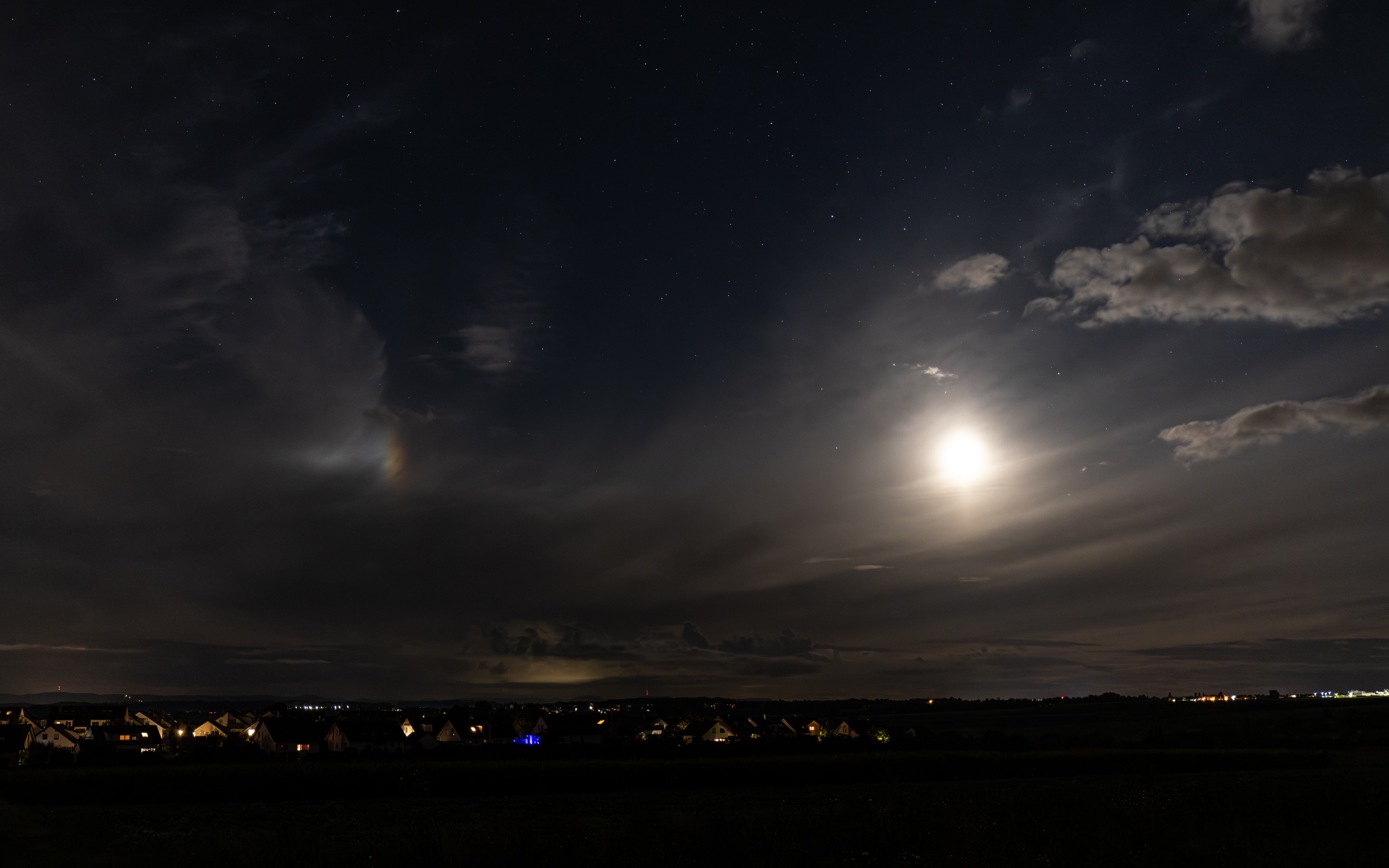 Am Abend des 12. September gab es eine Polarlichtwarnung, daher ging ich auf die Felder außerhalb meines Wohnorts Herrenberg. Während der Ausschau nach Polarlichtern bemerkte ich, dass der Mond einen Nebenmond besass. Durch den Kälteeinbruch, gab es wohl genügend Eiskristalle. Die Luft war auch sehr klar, der Fernmeldeturm links unten am Bildrand ist der Pletterbergturm bei Balingen auf der Schwäbischen Alb. Er ist ca. 40 km Luftlinie entfernt.