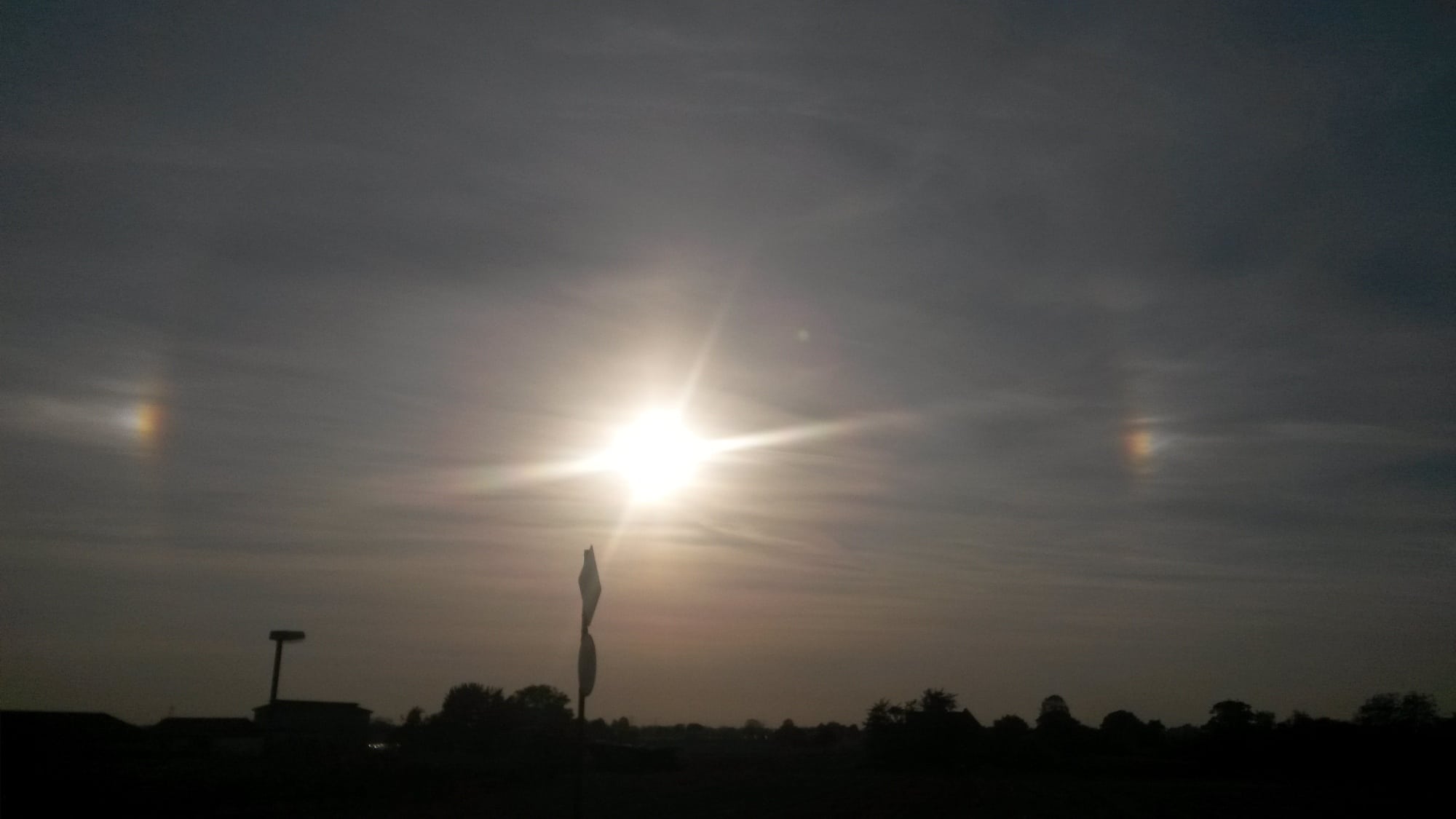 Am 17. Oktober 2018 stach mir dieses spektakuläre Ereignis in die Augen. Zwei kräftige Nebensonnen, sowie zwei deutliche Halos um die Sonne. Die Aufnahme fertigte ich mit meinem alten Smartphone vom Straßenrand aus.