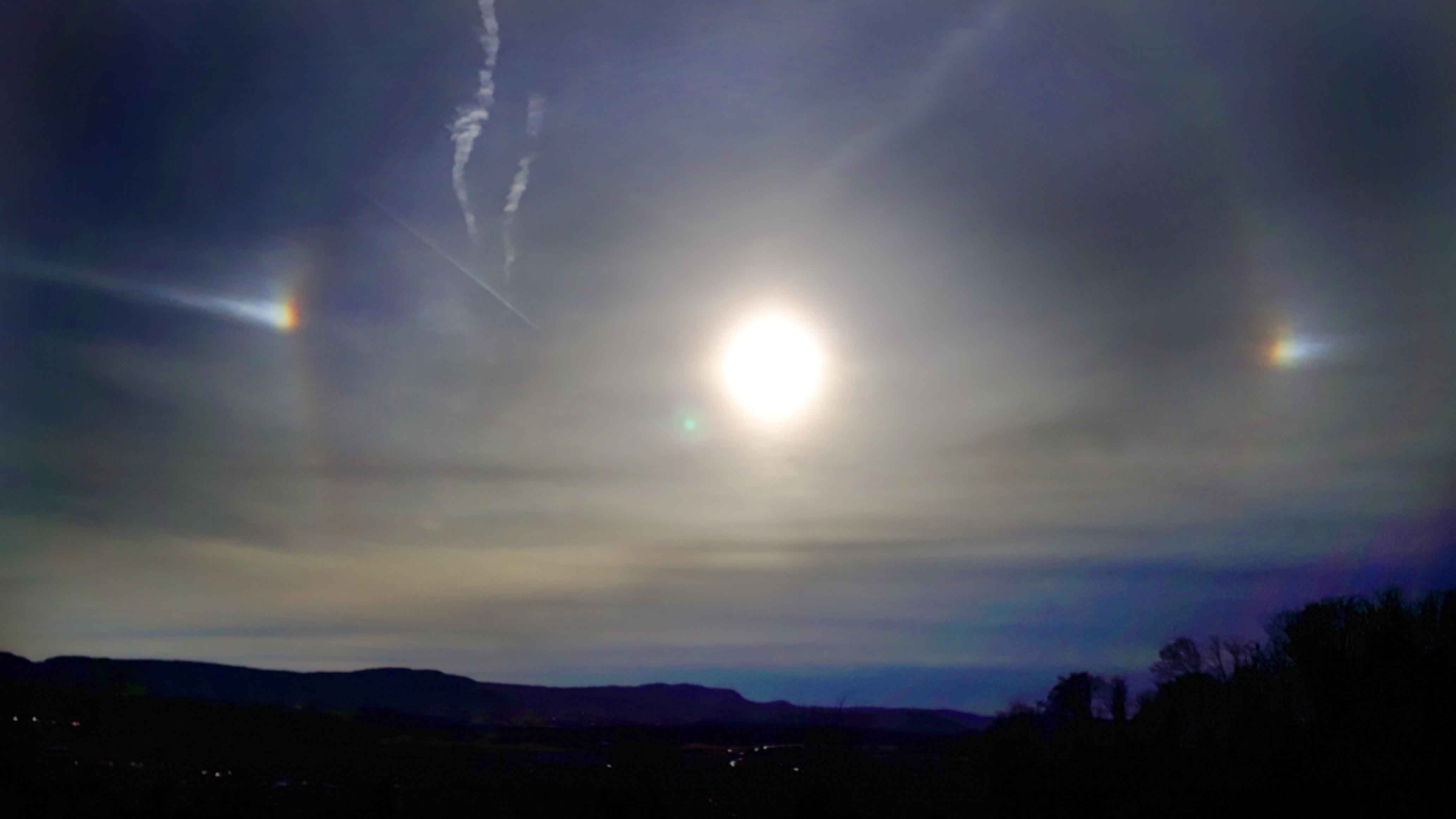 Diesen Augenblick erlebt man nur sehr selten, und er war auch nach wenigen Minuten wieder weg: die beiden Nebensonnen und der 22-Grad-Kreis um die Sonne. Diese Halo-Erscheinung wird durch kleinste hexagonale Eisplättchen in Cirruswolken verursacht, die auch noch weitgehend horizontal in der Wolke ausgerichtet sein sollten. Ich hatte bei dem Winter-Spaziergang nur mein Handy dabei, aber es hat genügt.