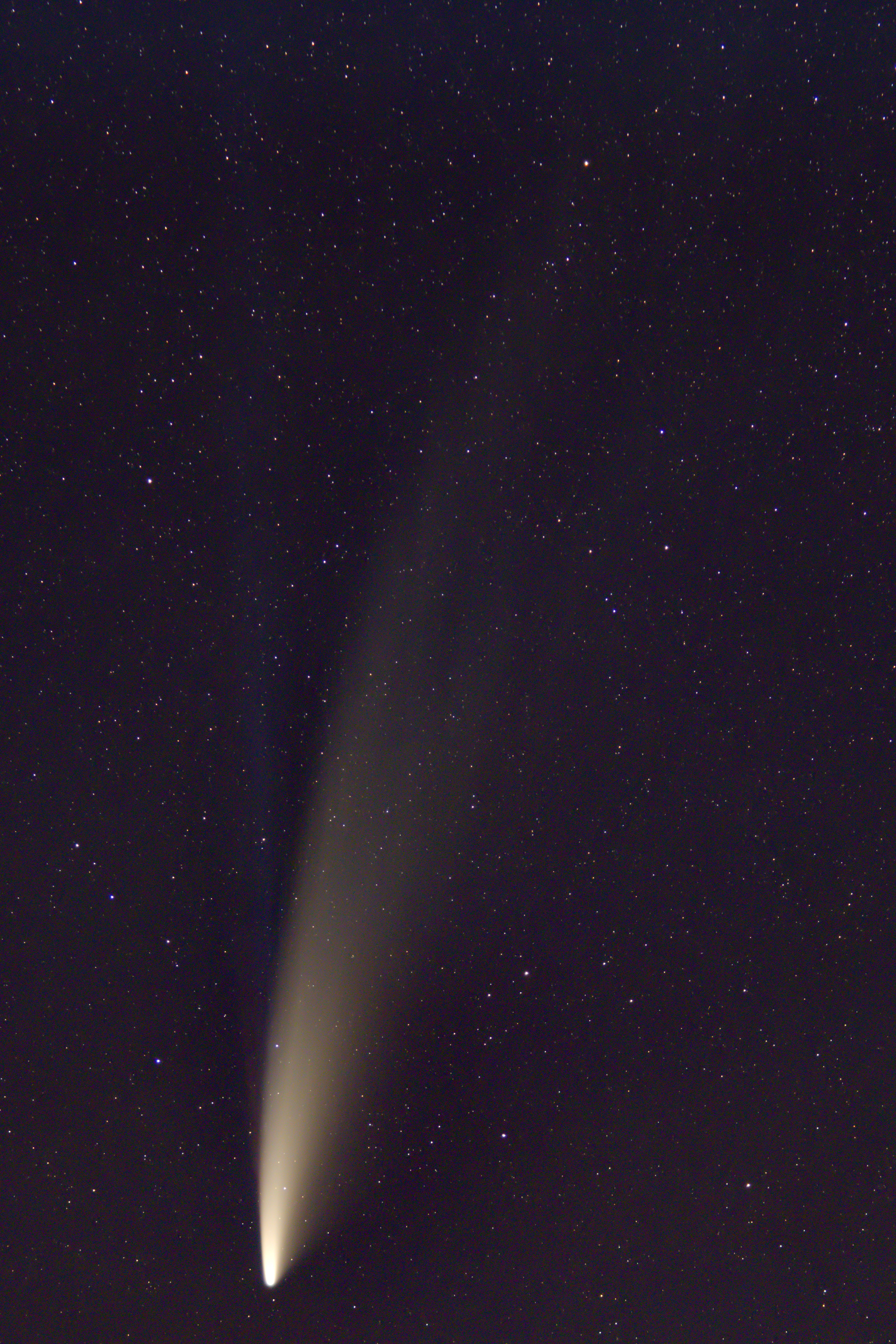 Der Komet Neoweise steht um 3:30 Uhr über dem Schauinsland bei Freiburg. Obwohl er nur wenige Grad über dem Horizont steht bietet der rund 10 Grad Schweif einen prächtigen Anblick. Im Stack zeigt sich auch der Plasmaschweif.