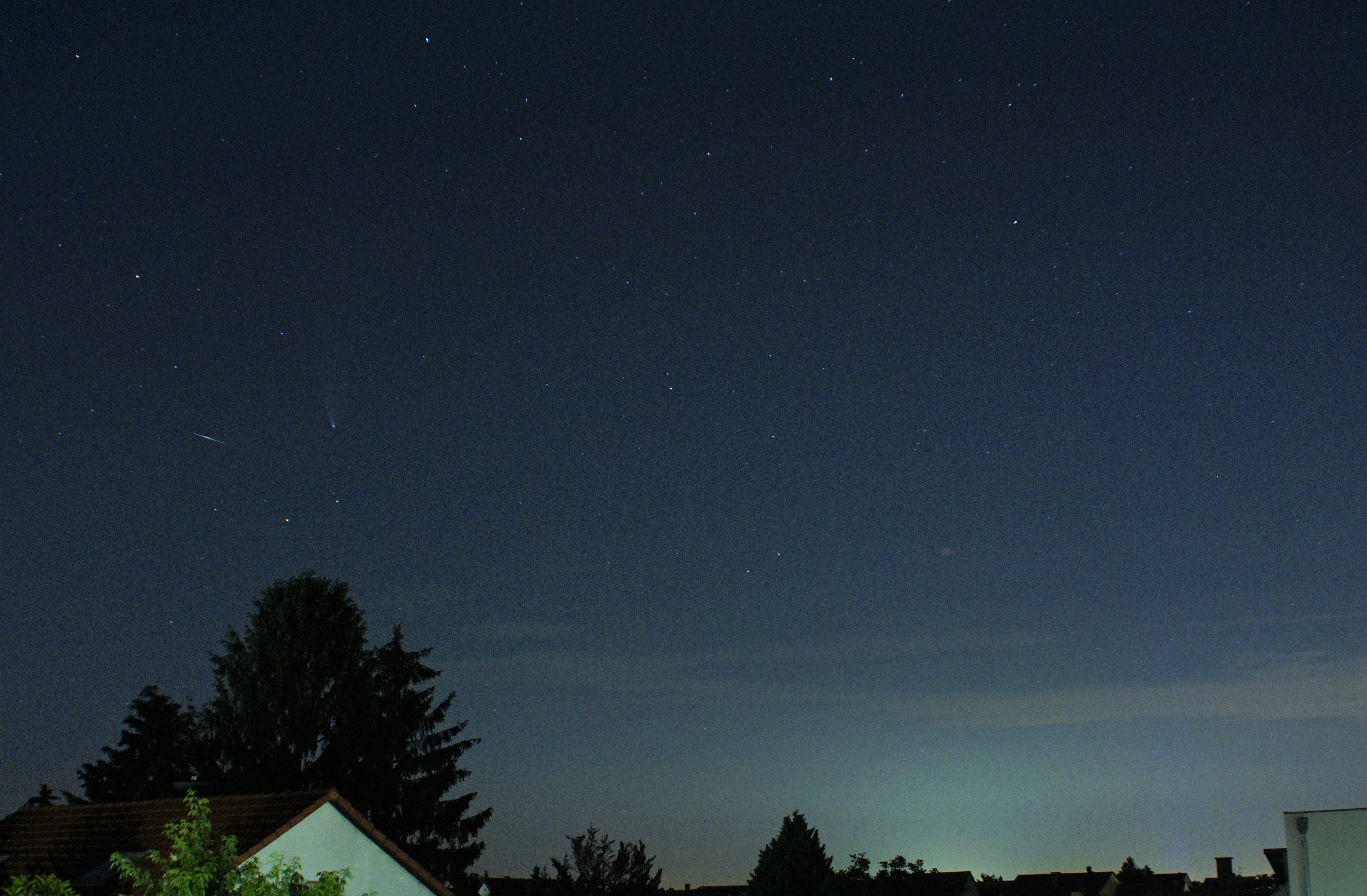 Die Aufnahme entstand am 22. Juli um 23:25 Uhr aus dem Dachfenster unseres Hauses in Neulußheim bei HD heraus mit Stativ ohne Nachführung. Bei der Kontrolle der Aufnahme stellte ich fest, dass sich während der kurzen Belichtungszeit ein Iridium-Flare direkt neben Neowise ereignet hat. Kamera Sony Alpha 77II, Sigma 28-300, F5/10s
