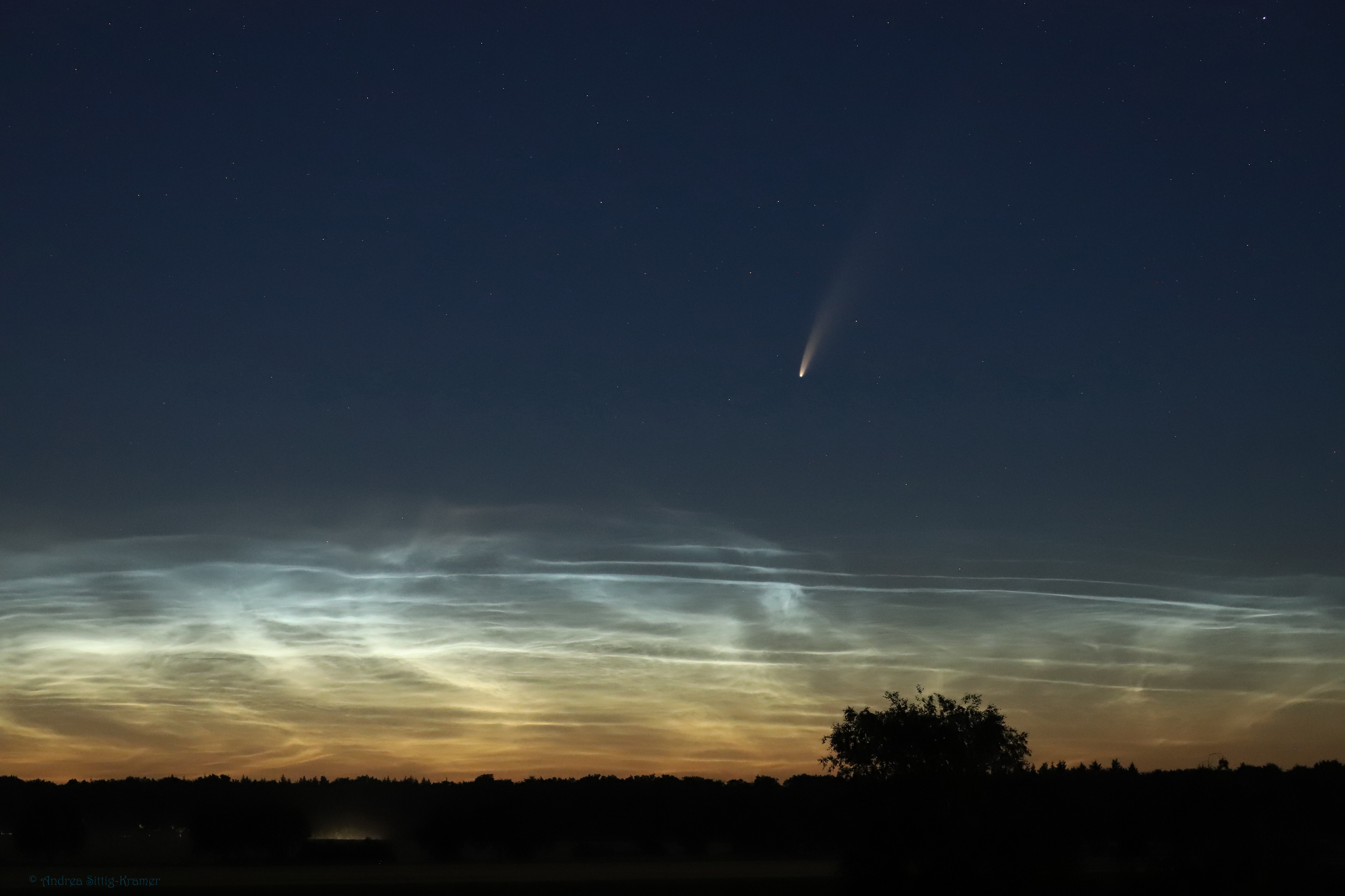 Auch am Abend des 11. Juli 2020 wurde der Nordhorizont im Landkreis Uelzen von wunderschönen Nachtleuchtende Wolken (NLC) aufgehellt. Mit zunehmender Dunkelheit erschien der Komet Neowise wie das Tüpfelchen auf dem „i“ über dem silbrig-goldenem Band. Das doppelt faszinierende Himmelsschauspiel konnte die ganze Nacht beobachtet und genossen werden.