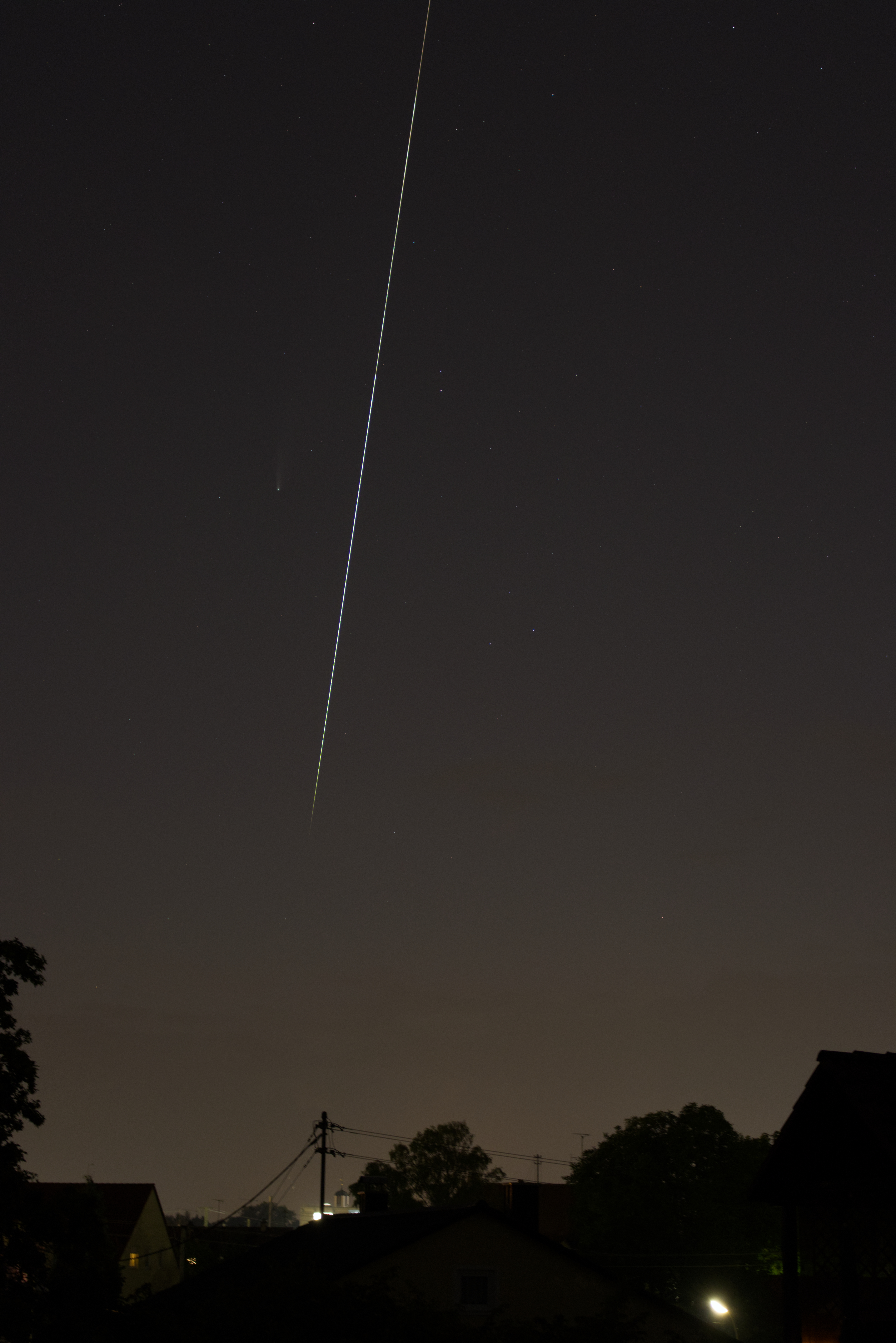 Wie die letzten Abende immer bei halbwegs freiem Himmel, hatte ich auch dieses Mal die Kamera auf dem Balkon aufgestellt, um Neowise zu fotografieren, war aber von der heute besonders deutlichen Lichtverschmutzung enttäuscht. Doch mit einem Mal stockte mir der Atem, als ich diesen unglaublich hellen und großen Meteor beobachtete, ganz dicht bei Neowise und die Kamera lief genau in diesem Moment - was für ein Glück!