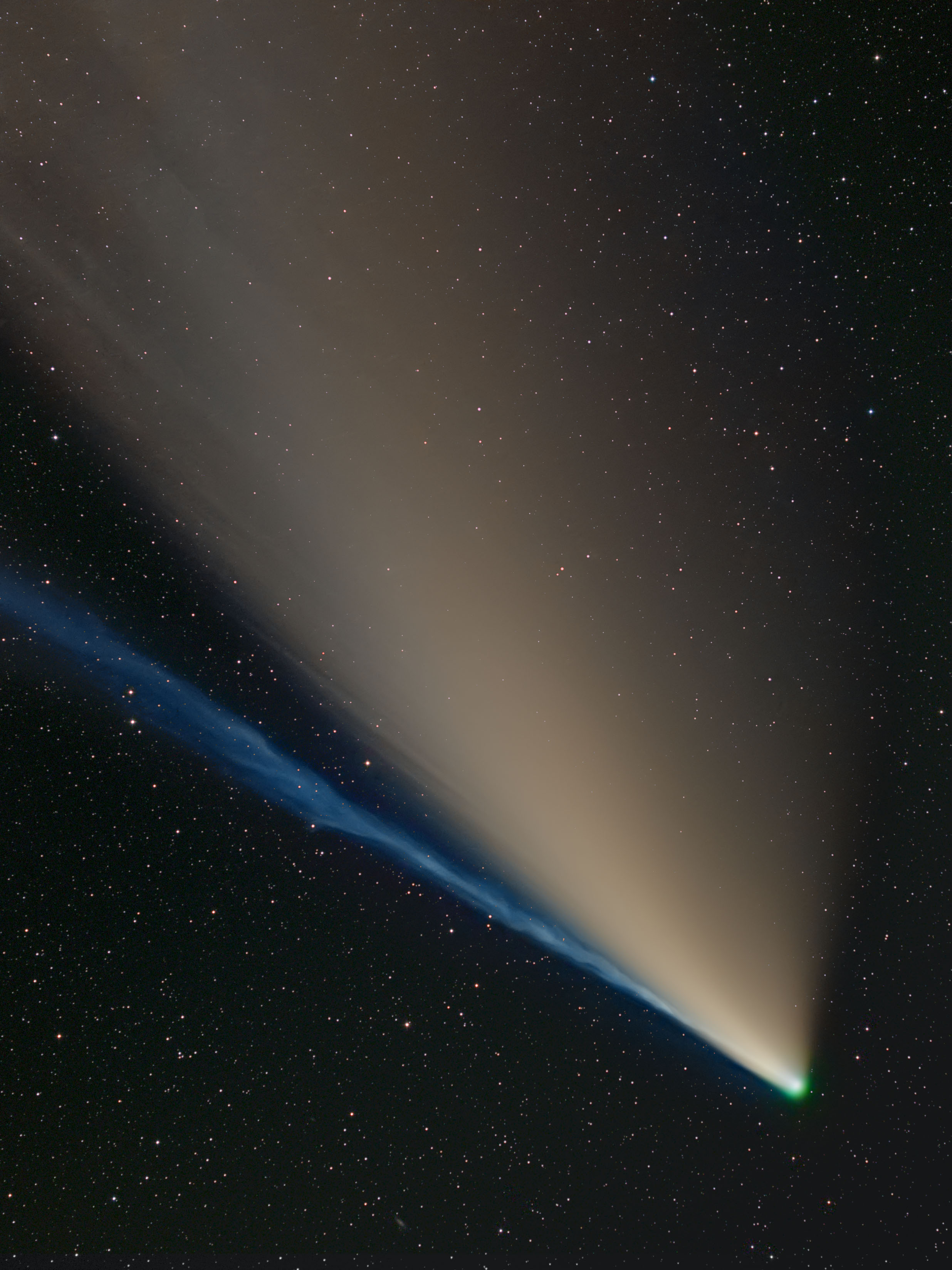 In der Nacht zum 22. Juli 2020 war es besonders klar und so lohnte es sich für mich, mit der Kameraausrüstung an einen besonders dunklen Ort weitab der störenden Lichtquellen zu fahren. Hier konnte ich den Kometen Neowise in seiner ganzen Pracht auf dem Sensor ablichten. Auffällig ist die grünleuchtende Koma, die ich noch eine Woche zuvor nicht beobachten konnte. Der blaue Ionenschweif zeigt sehr dynamische Strukturen, die sicherlich durch die Rotation des Kometenkerns entstanden sind.