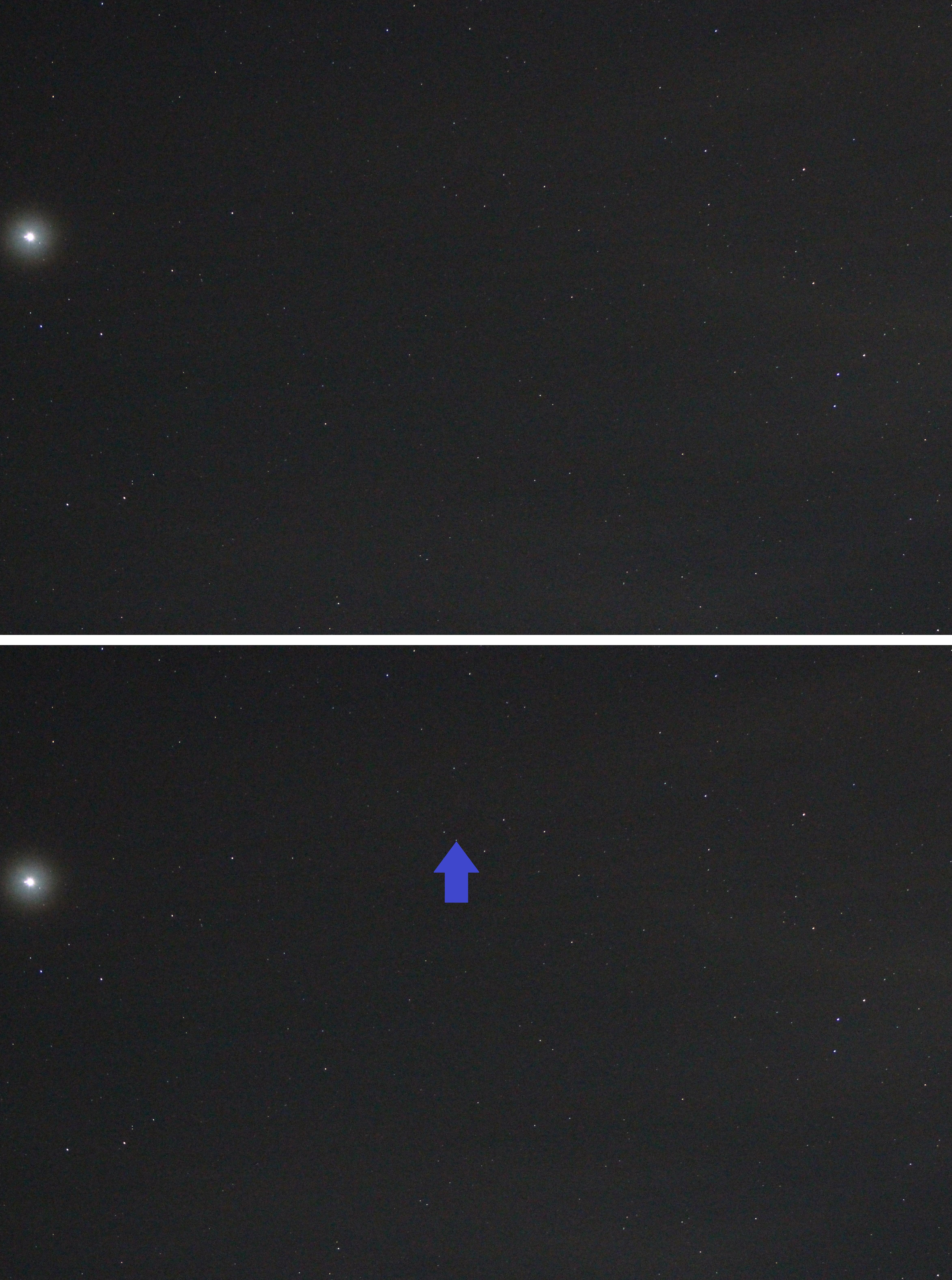 Neptun im Sternbild Wassermann an der Grenze zum Sternbild Fische. Auf dem unteren Bild, das zur gleichen Zeit mit dem gleichen Belichtungsparametern wie das obere Bild aufgenommen wurde und das auch den gleichen Himmelsausschnitt zeigt, ist der Planet Neptun mit einem blauen Pfeil markiert. Das helle Objekt am linken Bildrand ist der Planet Jupiter.