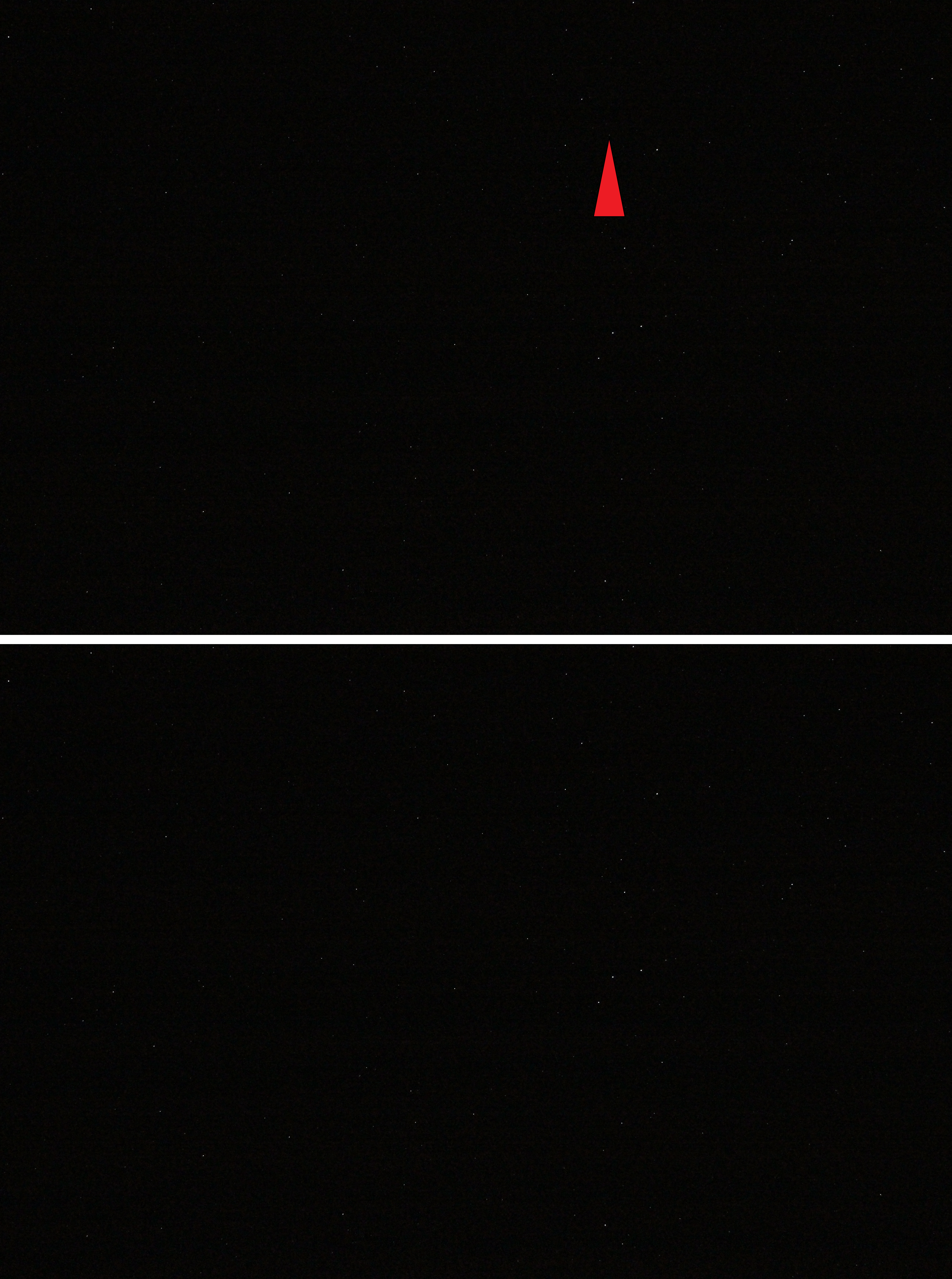 Zwei identische Bilder: auf dem oberen Bild ist Neptun mit einem rotem Dreieck markiert, auf dem unteren Bild nicht.