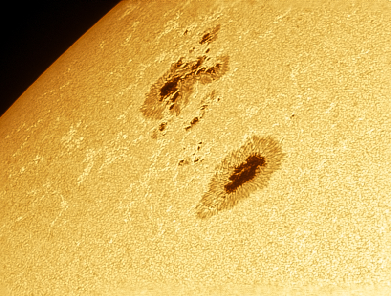 Sonne um 8 Uhr (ab 9 Uhr zogen wieder Wolken durch). Heute eine größere Fleckengruppe, die im Nordosten sichtbar wird. Der seit Tagen große Fleck zeigt tägliche Veränderungen. Aufnahme mit Herschelkeil, 1,6x-Barlow, ND- und Polarisationsfilter, Solar Continuum Filter)