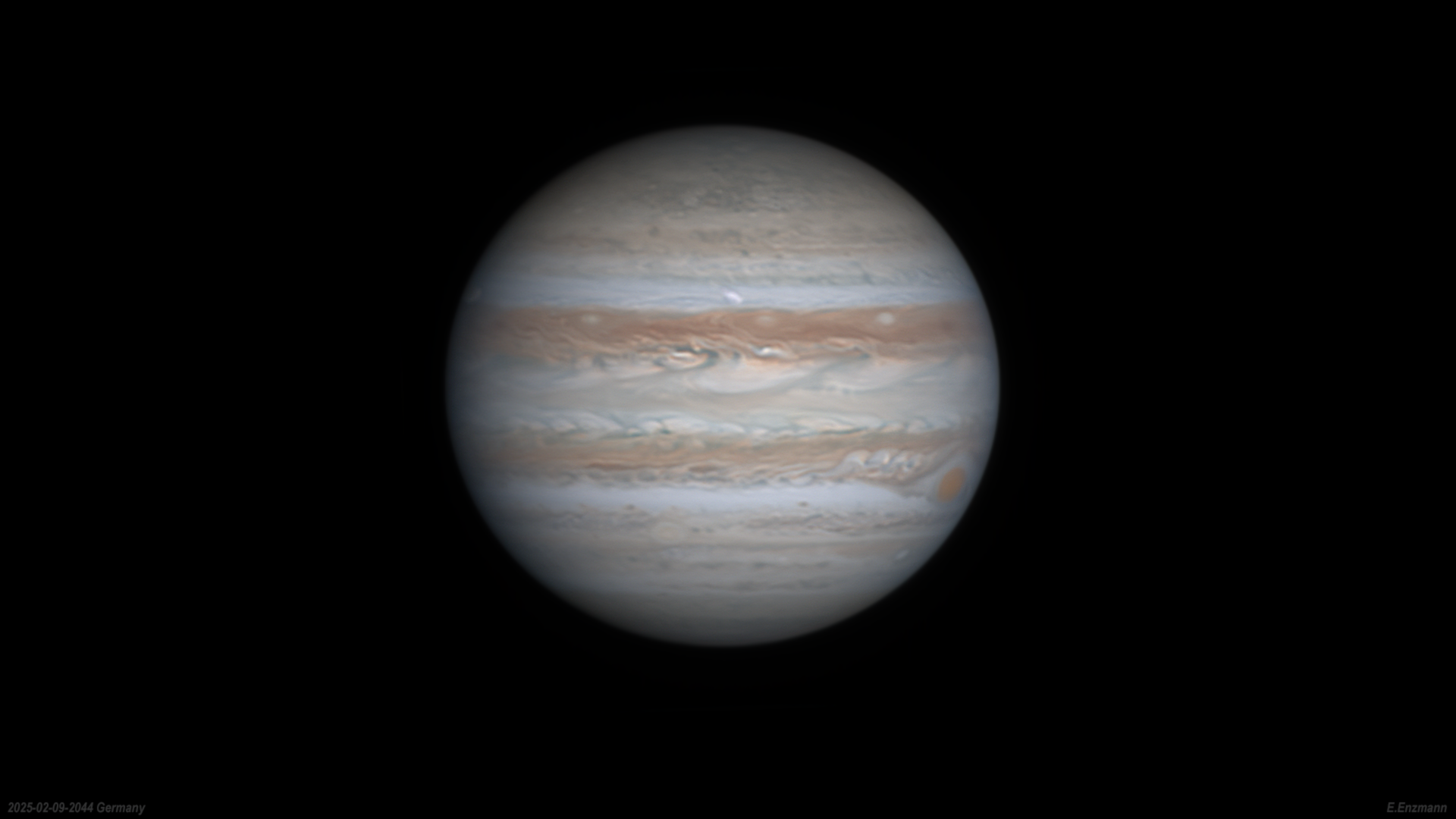 Es könnte sein, das sich ein weiterer 3. Ausbruch innerhalb von wenigen Wochen in Jupiters oberen weißem Band ereignet hat. Der weiße Fleck von der Mitte leicht nach oben könnte solch ein erneuter Ausbruch sein. Dies wird sich in den nächsten Tagen und Wochen zeigen. Die Aufnahme wurde südlich von München am 9. Februar 2025 off axis gemacht. Ein ADC von Gutekunst kam zum Einsatz.