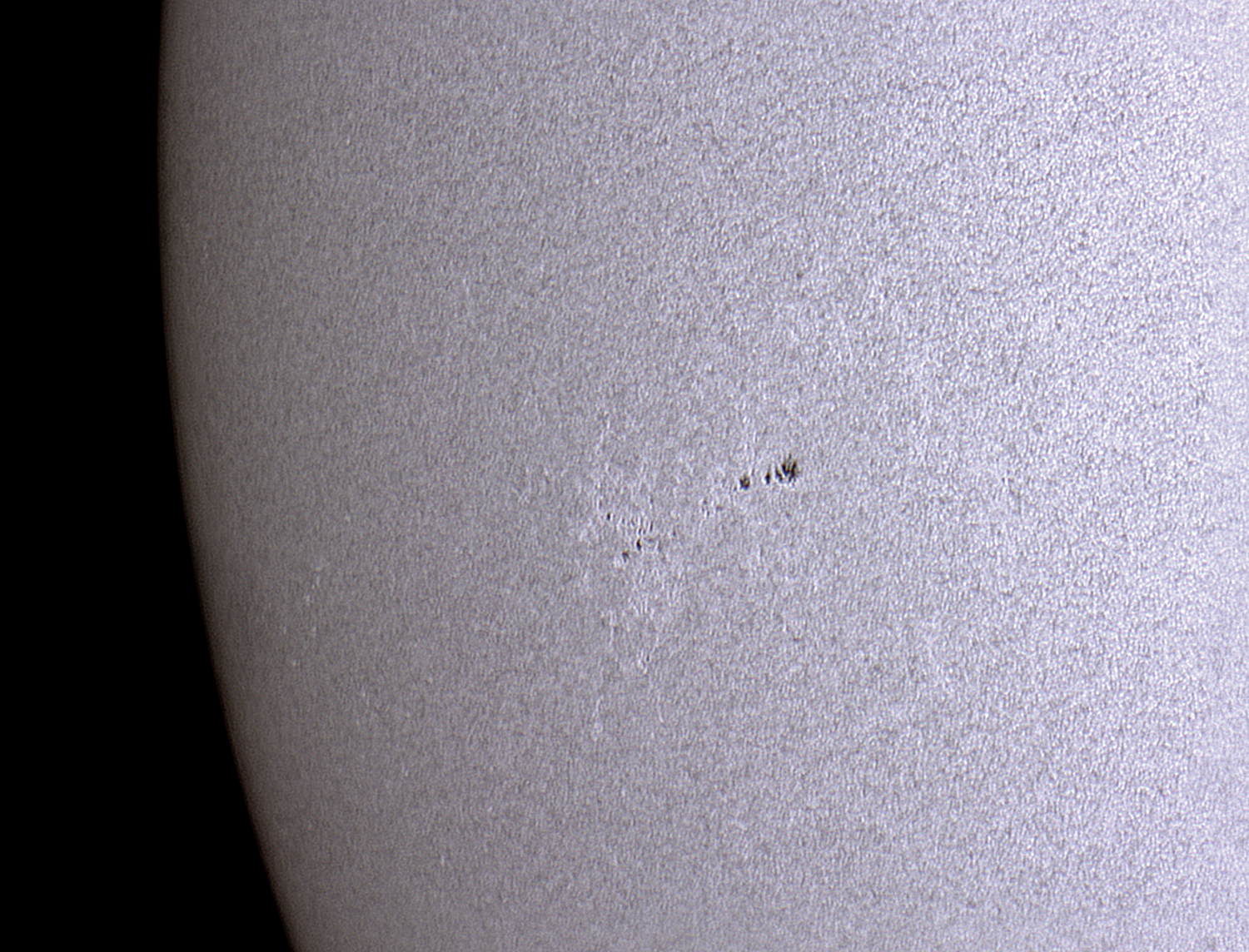 Bei den Bedingungen (Wolken, große Luftunruhe) ist es mit einem kleineren Gerät erfolgversprechender, das neue Fleckengebiet zu fotografieren. So entstand dieses Bild im Weißlicht mit dem (relativ) kleinen OMC 140 und Folie. Man beachte, dass die Fackeln bis zum Sonnenrand reichen.