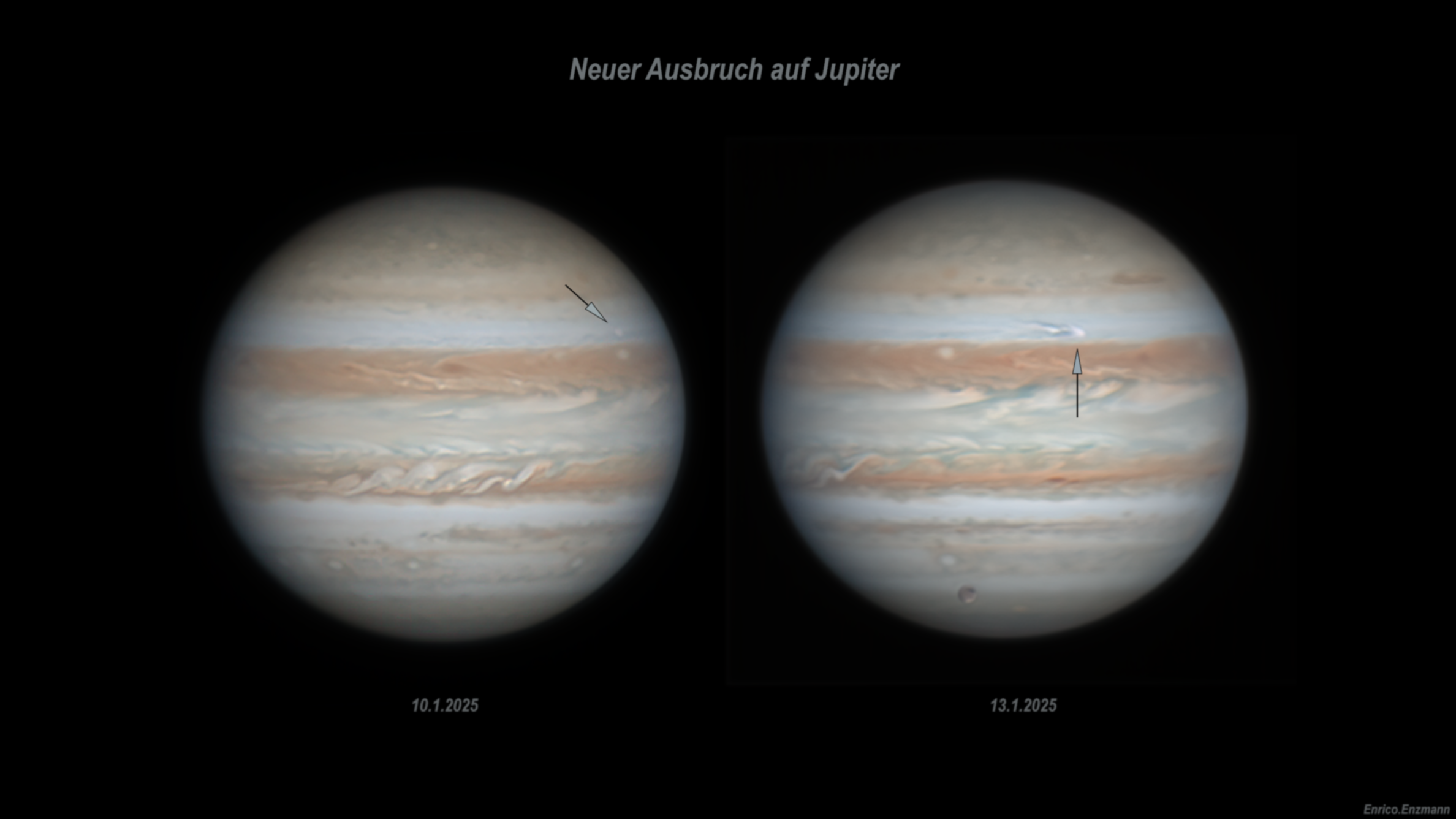 Am 10. Januar 2025 konnte ich erstmals den neuen Ausbruch im Wolkenband von Jupiter aufnehmen, siehe linkes Bild. Nur drei Tage später hat dieser enorm an Größe zugelegt, siehe rechtes Bild. Wie schon bei einem anderem hier veröffentlichten Bild erwähnt, ist dieser Ausbruch in einem Band mit einer enorm hohen Geschwindigkeit und wird unter anderem deshalb recht schnell an Größe weiter zulegen. Es könnte gut sein das sich dieser Ausbruch in wenigen Wochen auf die gesamte Jupiterbreite ausdehnt! Leider war bei beiden Bildern das Seeing nur sehr mittelmäßig und hat keine besseren Bilder zugelassen.