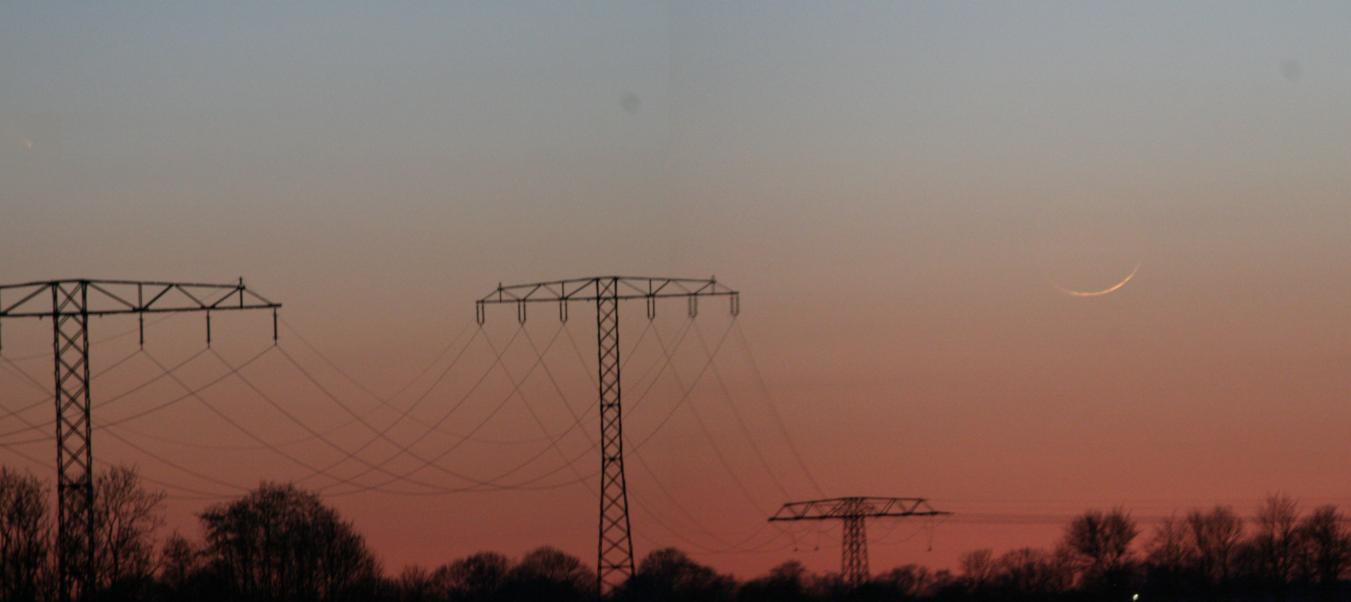 Zuerst sahen wir nur den neuen Mond (nur 22 Stunden, 25 Minuten alt!) neben den Strommasten, aber nach zehn Minuten war auch der Komet im Fernglas zu sehen. So machten wir von dieser interessanten Szene einige Fotos, die ich dann mit Photoshop zusammenfügte.