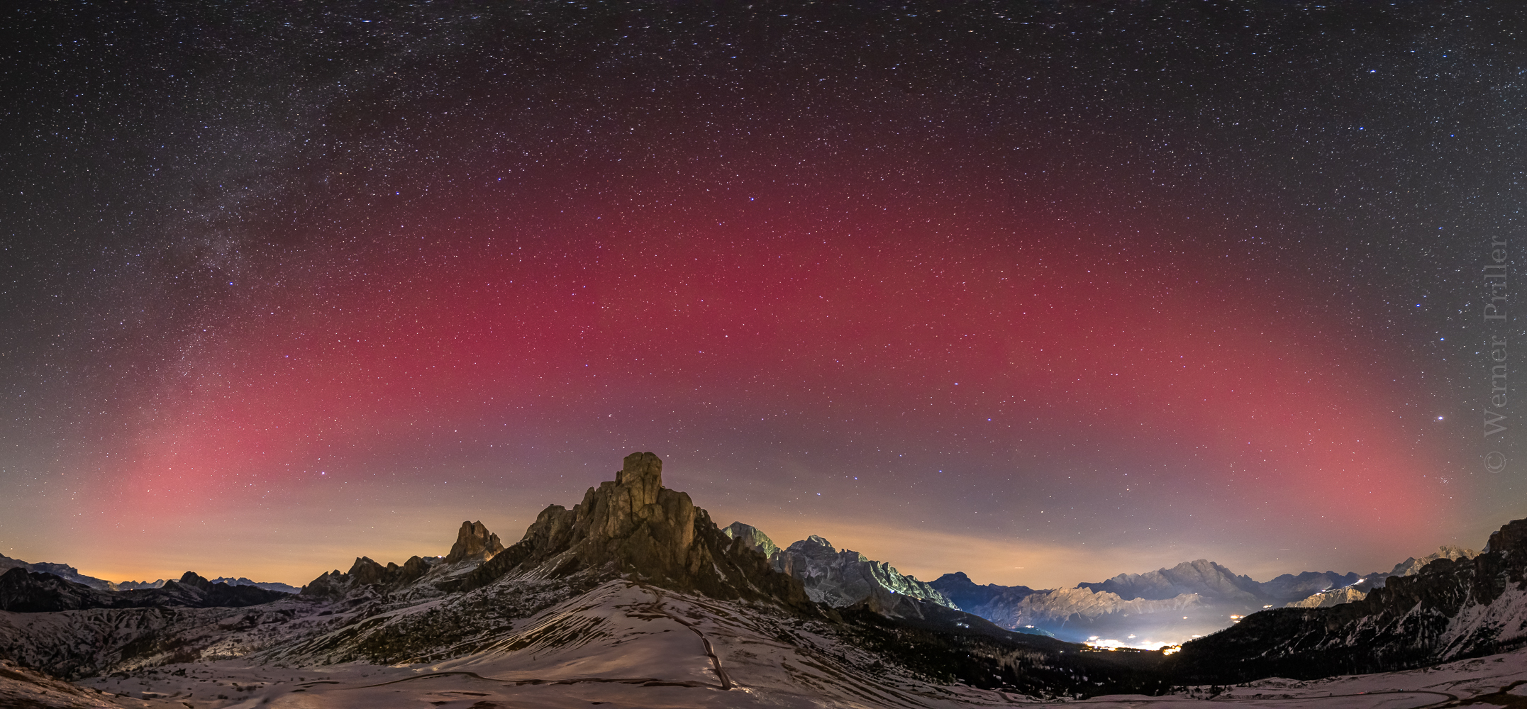 SAR-Bogen über dem Giau Pass, Dolomiten, am Neujahrsabend 2025. Das Polarlicht war zwar mit dem bloßen Auge fast nicht zu erkennen, doch stand der Bogen für über zwei Stunden 'regungslos' über den schroffen Bergen der Dolomiten. Von unten im Tal strahlen die Lichter Cortina d'Ampezzos um die Wette mit den himmlischen Lichtern darüber. Was für ein (unverhoffter) Start ins neue Jahr!