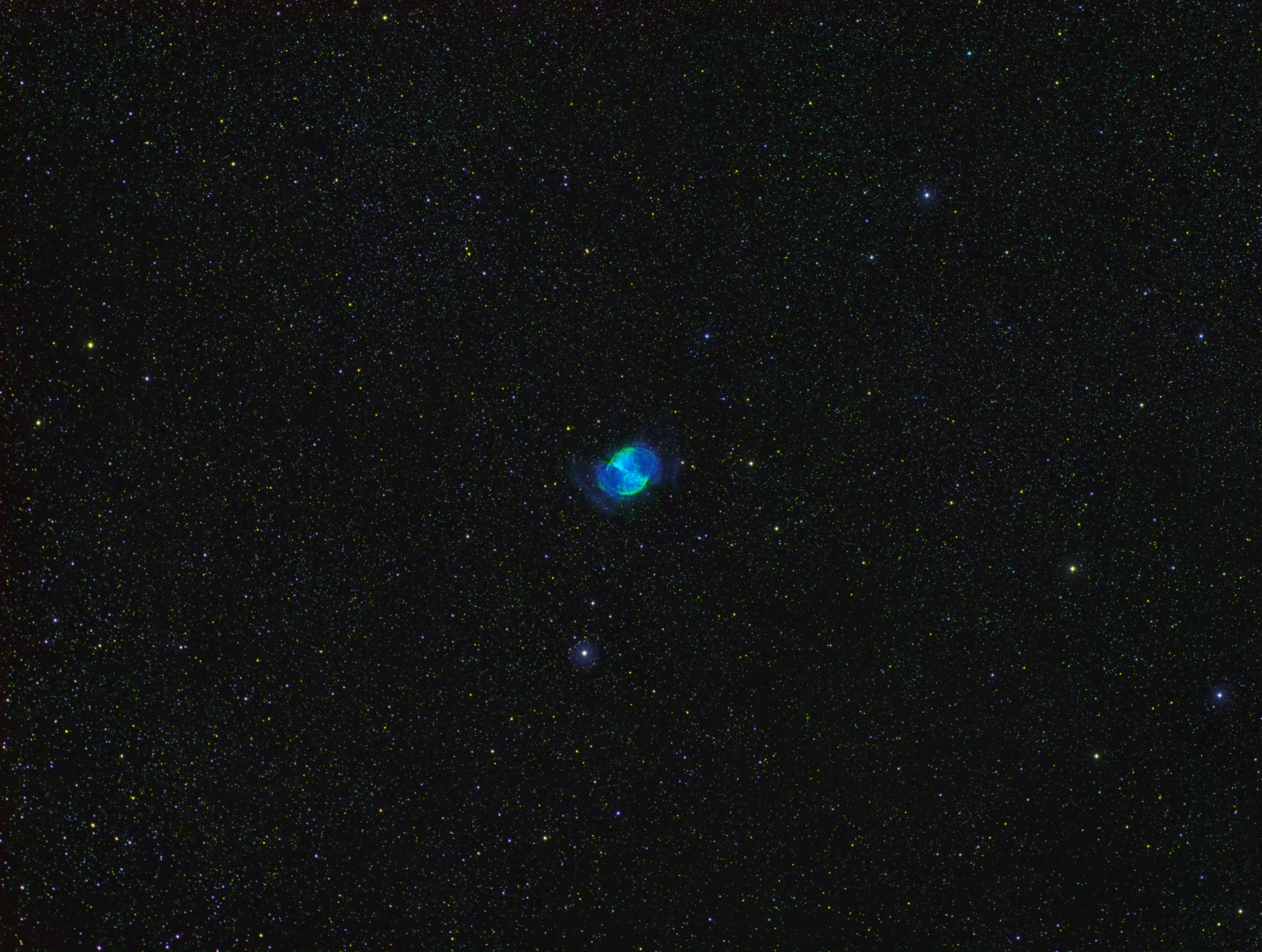 … könnte man bei dem weit auslaufenden Signal im OIII des Planetarischen Nebels Messier 27 meinen. Im Vergleich des S-, des H- und des O-Signals war das Leuchten des Nebels im O-Kanal so prägnant, dass ich das O-Signal zusätzlich als Luminanz beim Kombinieren zu einem LRGB-Bild verwendet habe.