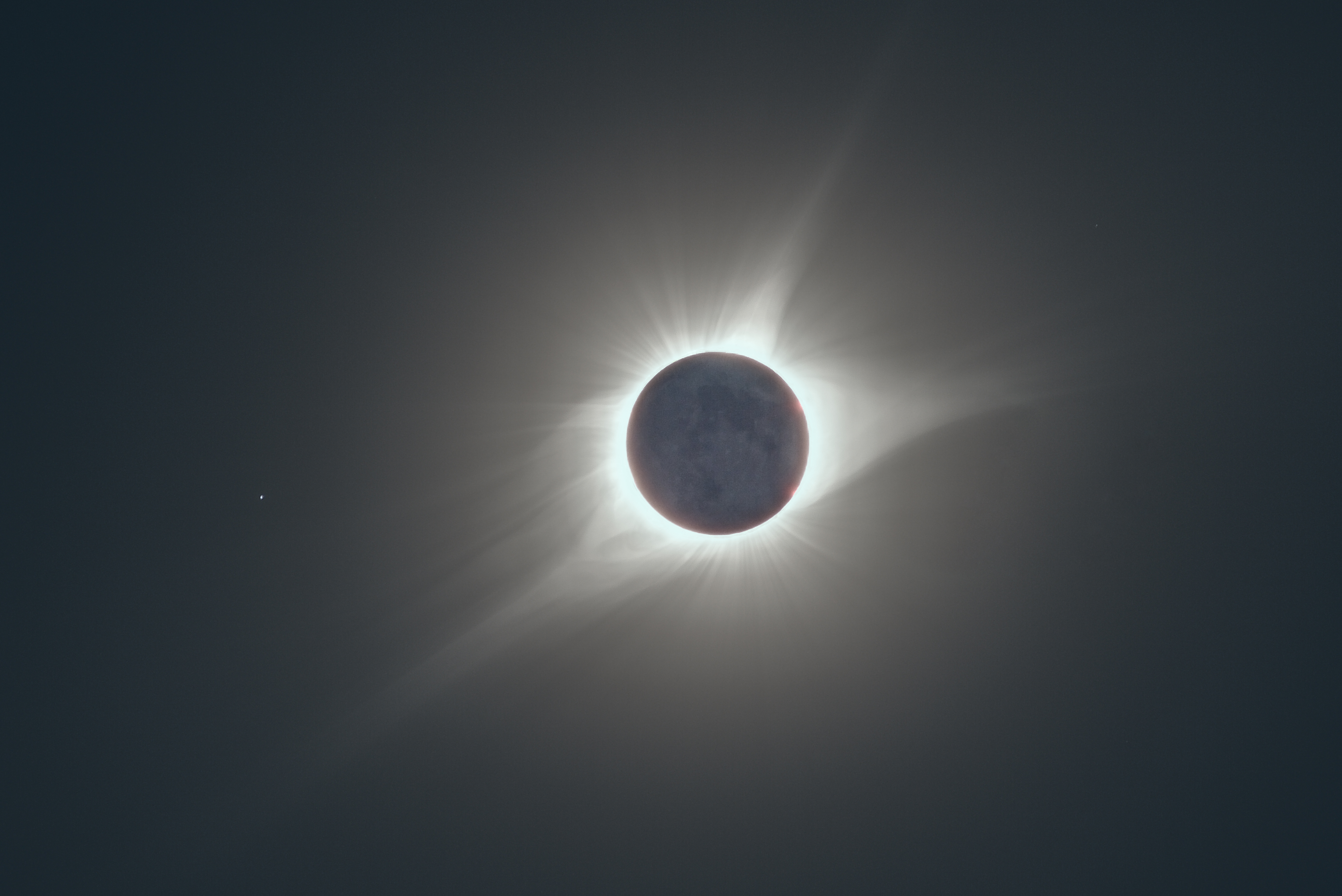 Die Bearbeitung der Belichtungsreihe gestaltete sich für mich schwieriger als erwartet. Daher habe ich die längeren Belichtungen in einem zweiten Komposit zu einem deutlich helleren Bild verarbeitet, auf dem der Mond im Erdlicht gut zu erkennen ist. Auch die Korona reicht sehr viel weiter in das Bild hinein als auf der kürzer belichteten Aufnahme.