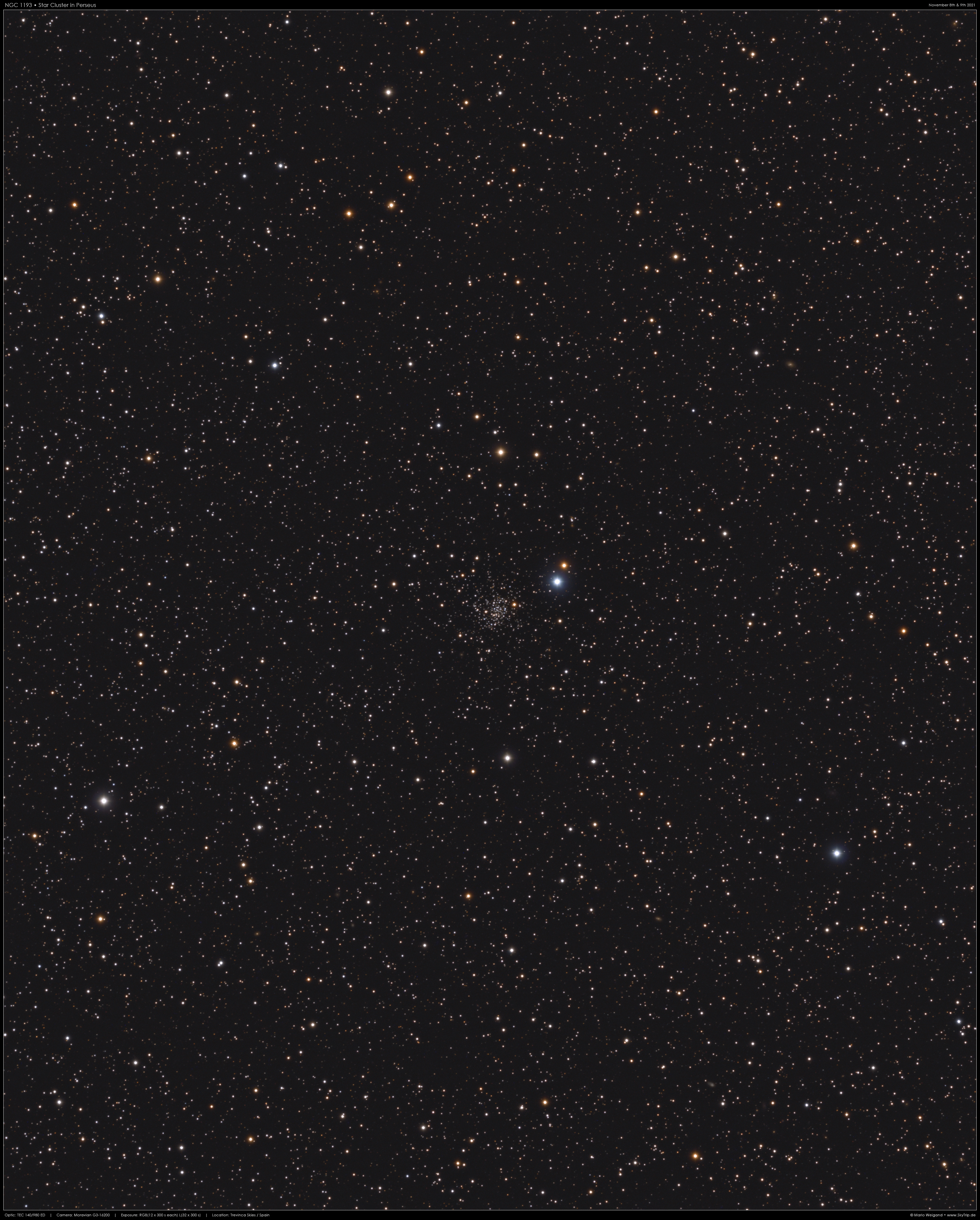 Ein selten beachteter Sternhaufen im Sternbild Perseus ist NGC 1193 in rund 14000 Lichtjahren Entfernung. Mit acht Milliarden Jahren weist er ein relativ hohes Alter auf udn besitzt daher ausschließlich gelbe und rötliche Sterne. Die heißen blauen Sterne sind aufgrund ihrer vergleichsweise geringen Lebenserwartung schon lange Vergangenheit. Mit drei Bogenminuten scheinbarem Durchmesser bietet er sich eher für mittlere bis lange Brennweiten als Fotomotiv an. http://www.skytrip.de