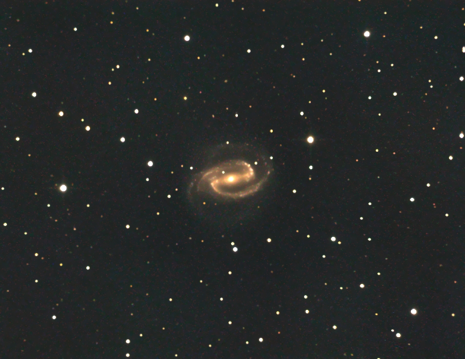 Eine der besten Beispiele für Balkenspiralen ist NGC 1300 (Typ SBbc, Entfernung 70 Millionen Lichtjahre, Größe 135000 Lichtjahre, entdeckt 1835 von Sir John Herschel), die im südwestlichen Teil des bei uns sichtbaren Teil des Eridanus isoliert liegt. Mit 10,3 mag ist sie relativ hell, allerdings sind die äußeren Teile ihrer Spiralarme sehr schwach und deshalb habe ich die Hälfte der L-Belichtungszeit mit 2x2 Binning aufgenommen. Mehrere Anläufe habe ich trotzdem gebraucht (schlechtes Seeing, Dunst, Deklination -20 Grad), um 6 Stunden Belichtungszeit zu erreichen.