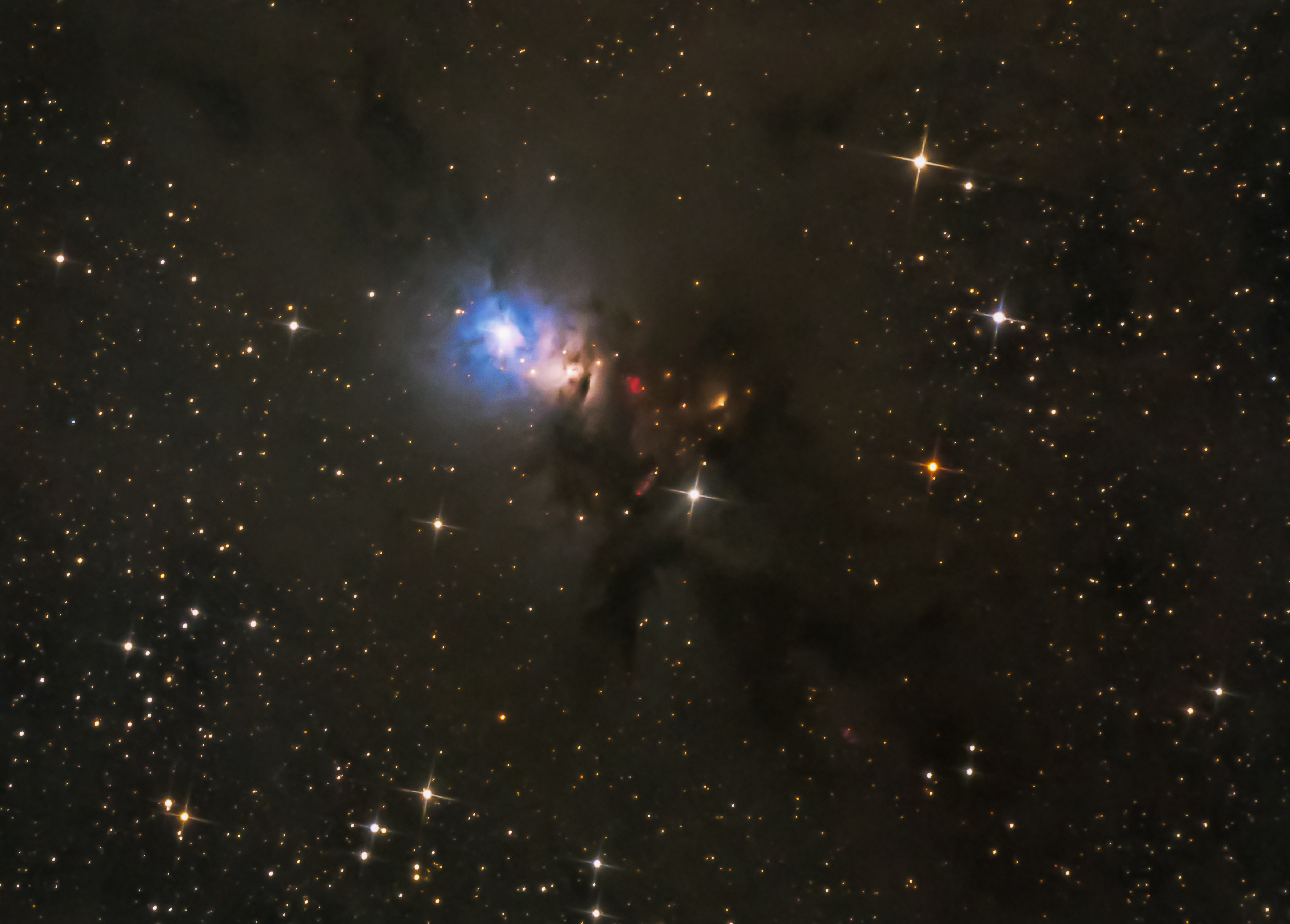 Etwa 1000 Lichtjahre entfernt liegt im Randgebiet der Perseus-Molekülwolke der Reflexionsnebel NGC 1333, auch als Embryo-Nebel bekannt. Wolken von interstellarem Staub lassen das Licht dahinter kaum durchscheinen. Heftige Sternwinde vom blauen Stern, dessen Staub das Sternlicht streut, sind im oberen Teil zu erkennen. Weiter unten scheint ein Stern durch Filamente aus dunklem Staub hindurch. Eine diagonale Reihe schwacher Begleitsterne erscheint rötlich, da Staub das Sternlicht filtert und rotes Licht durchlässt.