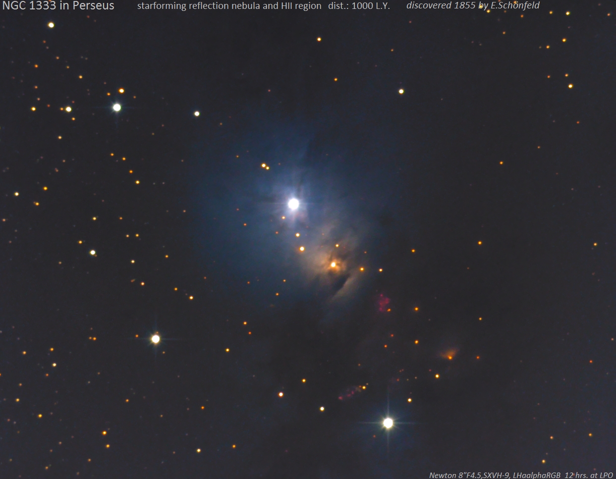 Meine Version von NGC 1333. NGC 1333 war eines der Lieblingsobjekte von Edwin Hubble – neben NGC 2261(Hubbles Variable Nebula). Er fotografierte ihn gleich nach dem First Light des 100"-Hooker-Reflektors im Jahr 1919.