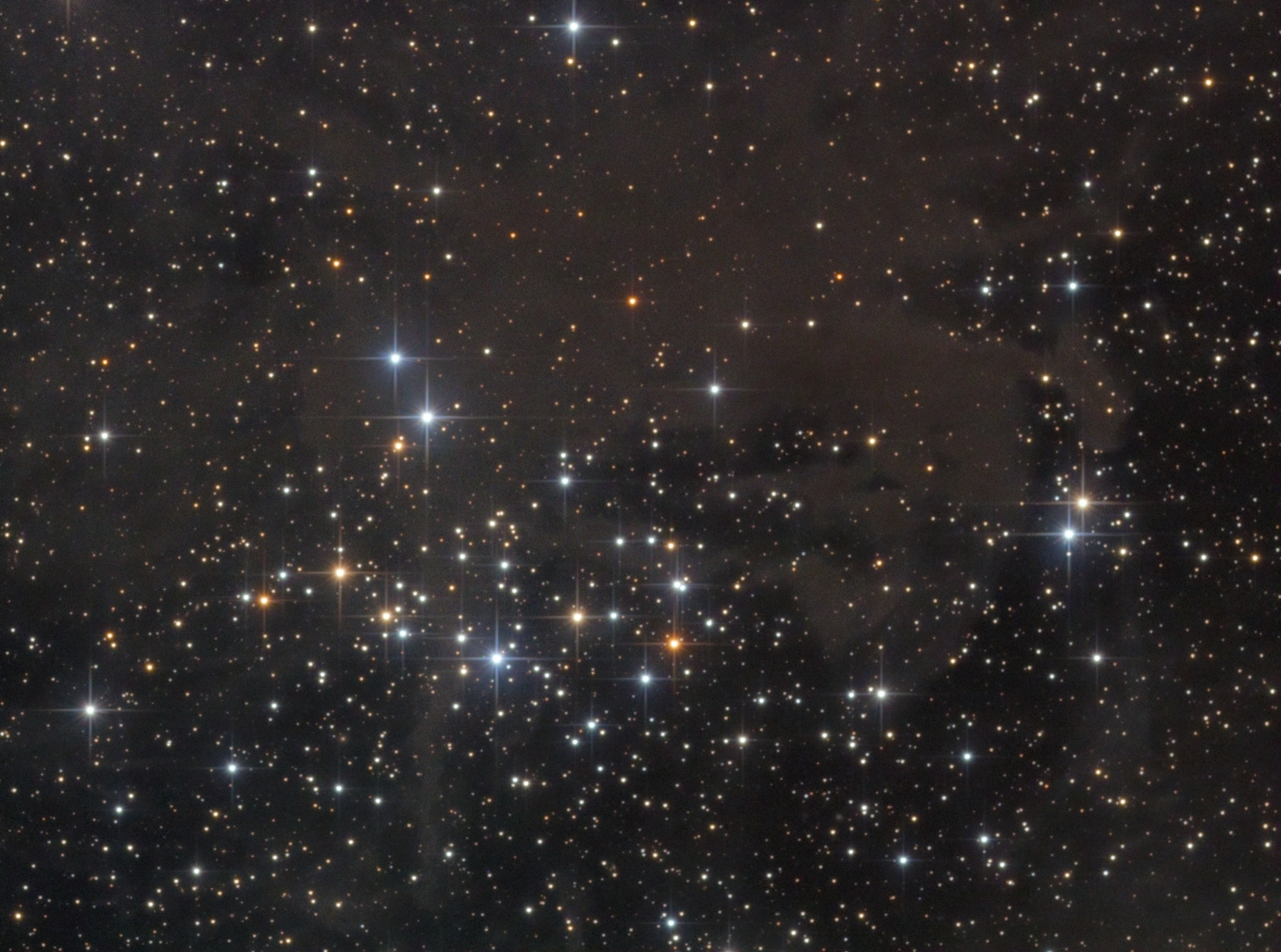 NGC 1342 ist ein offener Sternhaufen im Perseus und zeigt viele Sterne mit verschiedenen Farben. Eingebettet ist der Haufen in Staub und Gas - davon finden sich zwischen den Sternbildern Stier und Perseus große Mengen.