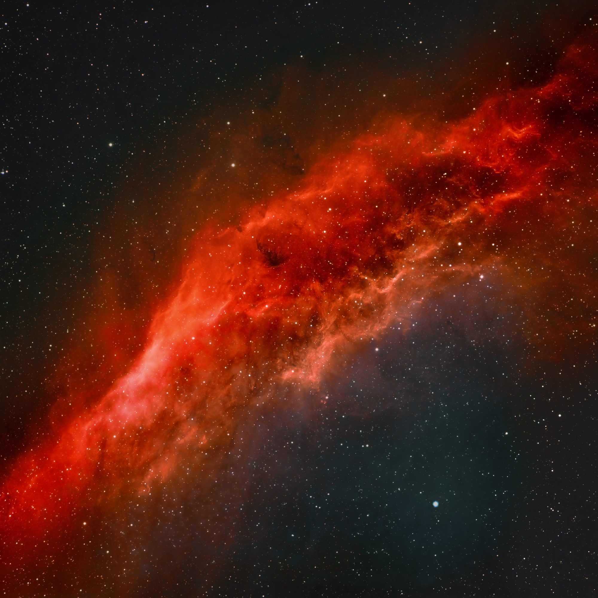 NGC 1499 - der California-Nebel, emittiert vor allem stark in H-alpha und überraschend stark in SII, was bei ausgedehten Nebelobjekten eher selten vorkommt. OIII ist hingegen fast gar nicht vorhanden. Dies macht die Farbkomposition aus Schmalbandaufnahmen zur besonderen Herausforderung.