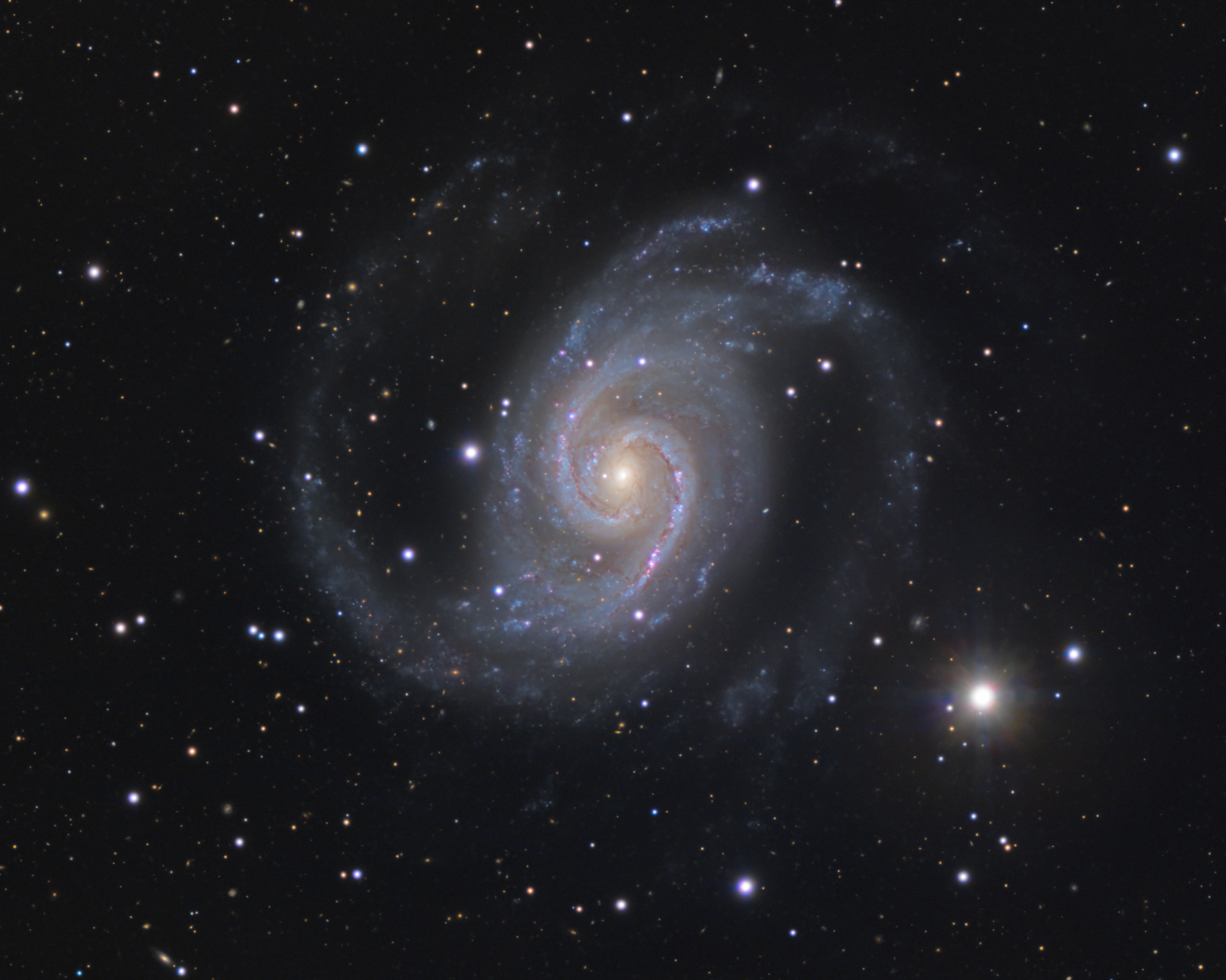 Dieses Bild zeigt meiner Meinung nach eine der detailliertesten Amateuraufnahmen dieser Galaxie am südlichen Himmel. Ich habe dieses Bild im Dezember 2025 über zwei Nächte hinweg mit dem Baader Planetarium Remote Observatory bei DeepSkyChile aufgenommen. Es handelt sich um einen 1-m-Planewave-Reflektor (PW CDK1000), der auf einer azimutalen Montierung montiert ist, sodass die Kamera während der Beobachtung gedreht werden muss. Diese Konfiguration funktioniert hervorragend – bei einer Brennweite von sechs Metern ist keine aktive Nachführung erforderlich –, hat jedoch den Nachteil, dass es zu rotierenden Spikes kommt. Bei der Nachbearbeitung werden die Spikes aus dem Endergebnis herausgefiltert, jedoch bleiben bestimmte Strukturen um die Sterne herum zurück, die auch auf diesem Bild zu erkennen sind. Der Bilddetektor war eine Moravian C5A-100M CMOS-Kamera mit einem Sony IMX461-Sensor, einer Auflösung von 11664 x 8750 Pixeln und einer Pixelgröße von 3,76 x 3,76 µm.