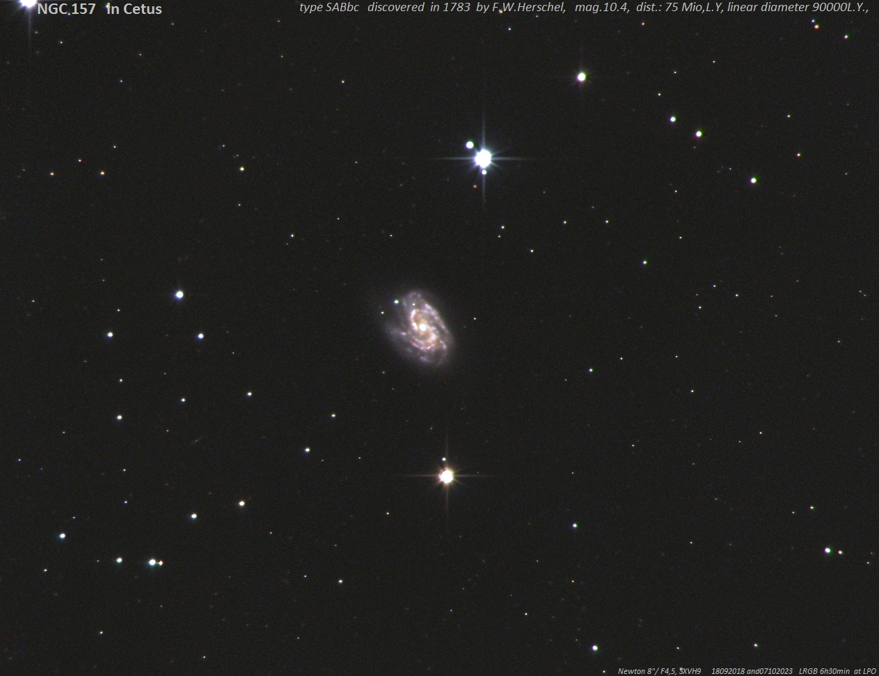 Dies ist eine schöne Balkengalaxie (10,4 mag) 10 Grad nördlich von Deneb Kaitos. Heuer konnte ich zu den Aufnahmen von 2018 weitere Frames hinzufügen, insgesamt 6.5 Stunden. Ausgedehnte Sternentstehungsgebiete befinden sich entlang der Spiralarme. 2009 wurde eine Supernova Typ Ic (Sn2009em) im südlichen Spiralarm sichtbar.