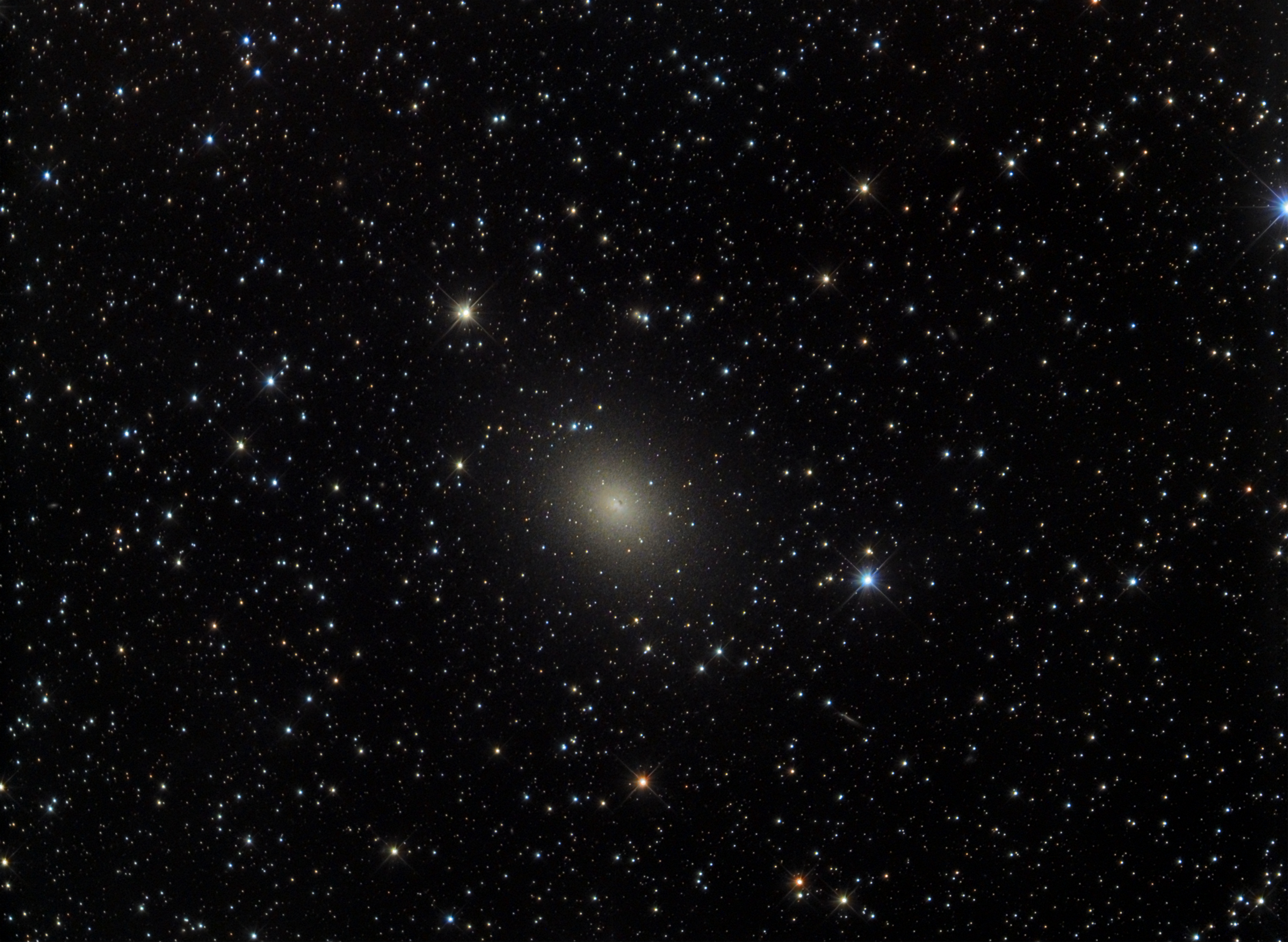 NGC 185 gehört zu unseren lokalen Gruppe und ist eine Begleitgalaxie des Andromedanebels. Als elliptische Zwerggalaxie erscheint sie zunächst unspektakulär. Bei näherem Hinschauen sieht sie doch körnig aus, von den anfänglich aufgelösten Einzelsternen. Darüber durchziehen sie dunkle Bereiche, ähnlich wie in der Blackeye-Galaxie M64, und "Schlieren", die die Gx durchziehen. Das sind wohl Auswirkungen von Begegnungen mit der großen M31?