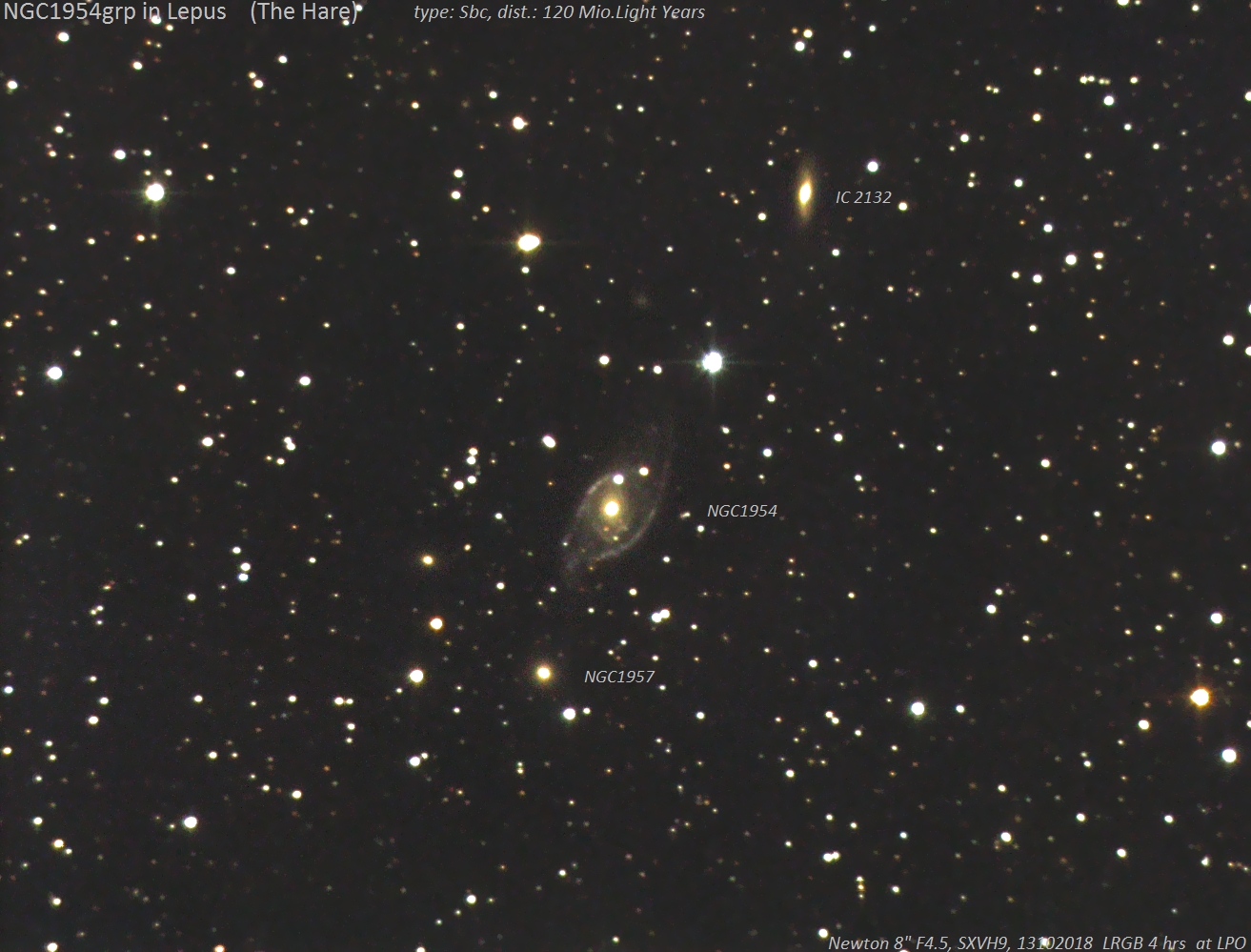 Die NGC1954-Galaxiengruppe wird selten aufgenommen, obwohl NGC 1954 von exquisiter Gestalt ist (Sbc, 120 Millionen Lichtjahre) und dieses Schicksal nicht verdient.