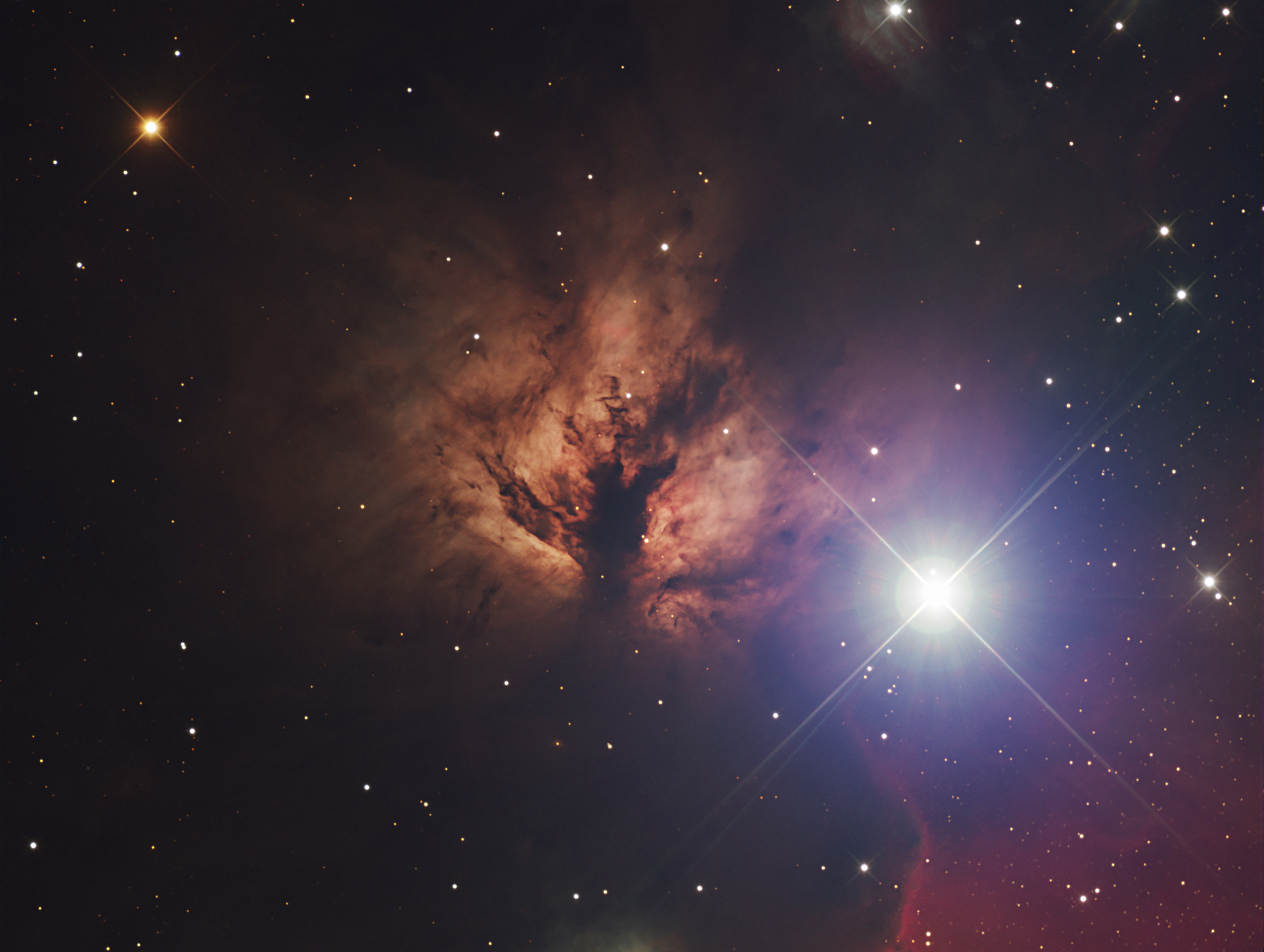 Der Flammennebel NGC 2024, ein Emissionsnebel im Sternbild Orion und Teil des Orion-Komplexes ist etwa 1500 Lichtjahre von uns entfernt. Der Nebel mit rund 6,5 Lichtjahren Durchmesser liegt unmittelbar östlich des hellen Gürtelsternes Alnitak (Zeta Orionis). Mit Infrarotmessungen wurde ein sehr dichter und sehr junger Sternhaufen im Zentralgebiet des Flammennebels entdeckt, wobei viele der Sterne von Akkretionsscheiben umgeben sind. Einer dieser Sterne dürfte auch die Ionisationsquelle des Nebels sein.