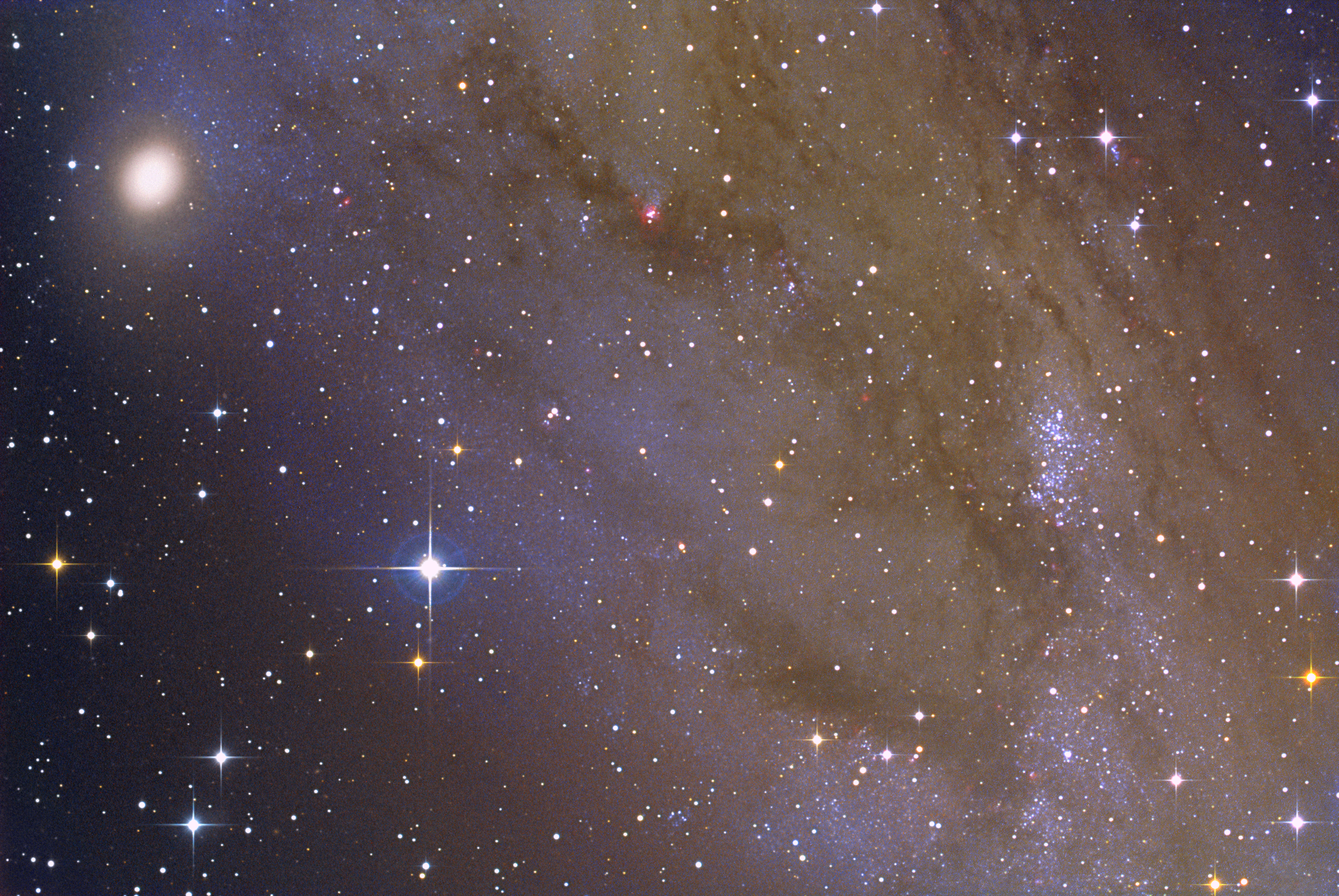 Auf dem Bild sieht man den südlichen Teil der Andromedagalaxie Messier 31, auch Andromedanebel genannt, die Spiralarme sind deutlich zu erkennen (Entfernung: rund 2,5 Mio. Lichtjahre). Oben links sieht man die Zwerggalaxie Messier 32, eine Begleiterin der Andromedagalaxie. Rechts zeigt sich eine sehr große Sternassoziation (NGC 206) innerhalb