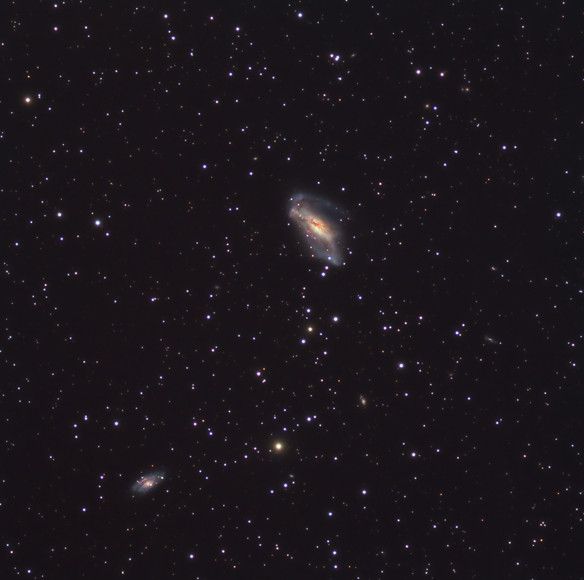 NGC 2146A unten links steht in Wechselwirkung mit NGC 2146, ist aber nicht an der Kollision beteiligt gewesen.