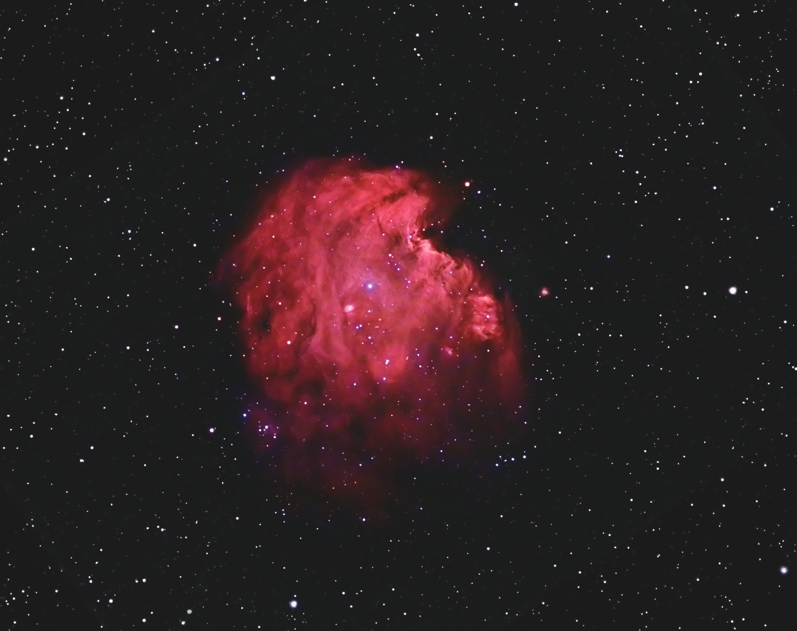 Außer dem Pferdekopf gibt es noch einen Affenkopf im Sternbild Orion: auf dem Bild im Profil mit Blickrichtung rechts. In einer der wenigen klaren Nächte in diesem Winter bei uns in Peine in Niedersachsen konnte ich ihn im H-alpha-Licht aufnehmen. Die Farbanteile stammen noch von einer früheren Aufnahme mit einer Canon EOS 1000Da.