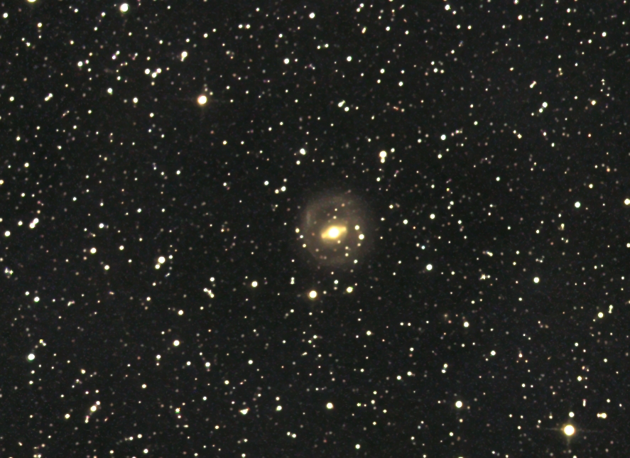 Nach langer Zeit konnte ich den Luminance-Frames endlich die Farbe hinzufügen. Neun Grad südlich von Mirzam (Beta CMa) bei –27,3 Grad Deklination liegt diese schöne, relativ unbekannte lentikuläre Ringgalaxie (10.7 mag, Typ SB0-a(rs), 4,7 x 4,3 arcmin, linear 100000 Lichtjahre) in rund 64 Millionen Lichtjahren Entfernung. Entdeckt wurde sie 1834 von John Herschel. Nur mit dem 6"-F5-Newton in der Rolldachhütte konnte ich sie erreichen. Dafür musste ich alle Frames im 2x2-BinningModus aufnehmen (Extinktion und Seeing !), insgesamt 5 Stunden lang.